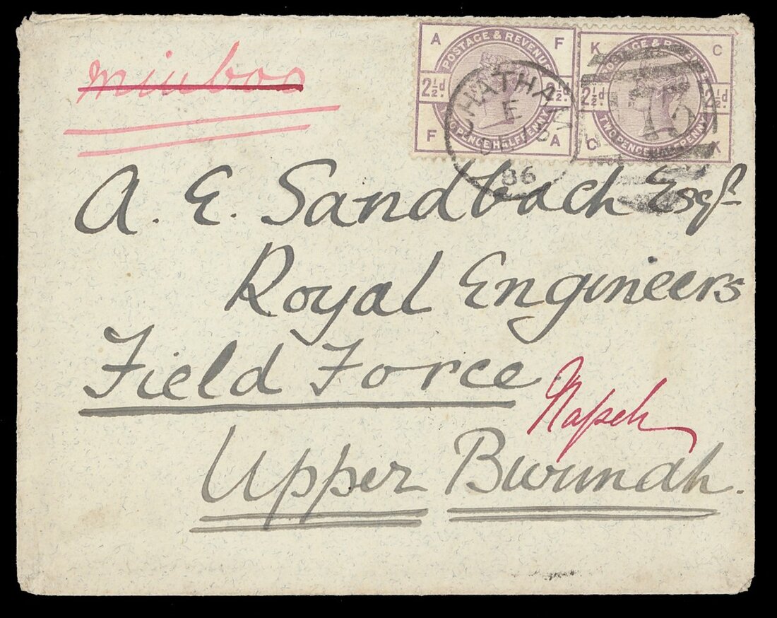 1886 (15 Dec.) envelope ex the Sandbach correspondence "Royal Engineers, Field Force, Upper Burmah", redirected to Minboo and again to Napeh, franked at 5d. and showing, on reverse, Sea Post Office, Rangoon, Mandalay and Minboo datestamp. Photos