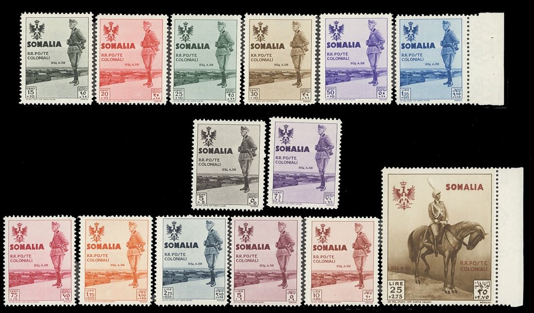 1935 Visit of King Victor Emmanuel III 5c+5c to 25l+2.75l, never hinged, difficult as such, fresh colour, centered chiefly fine. Sc. B38-B51, $850