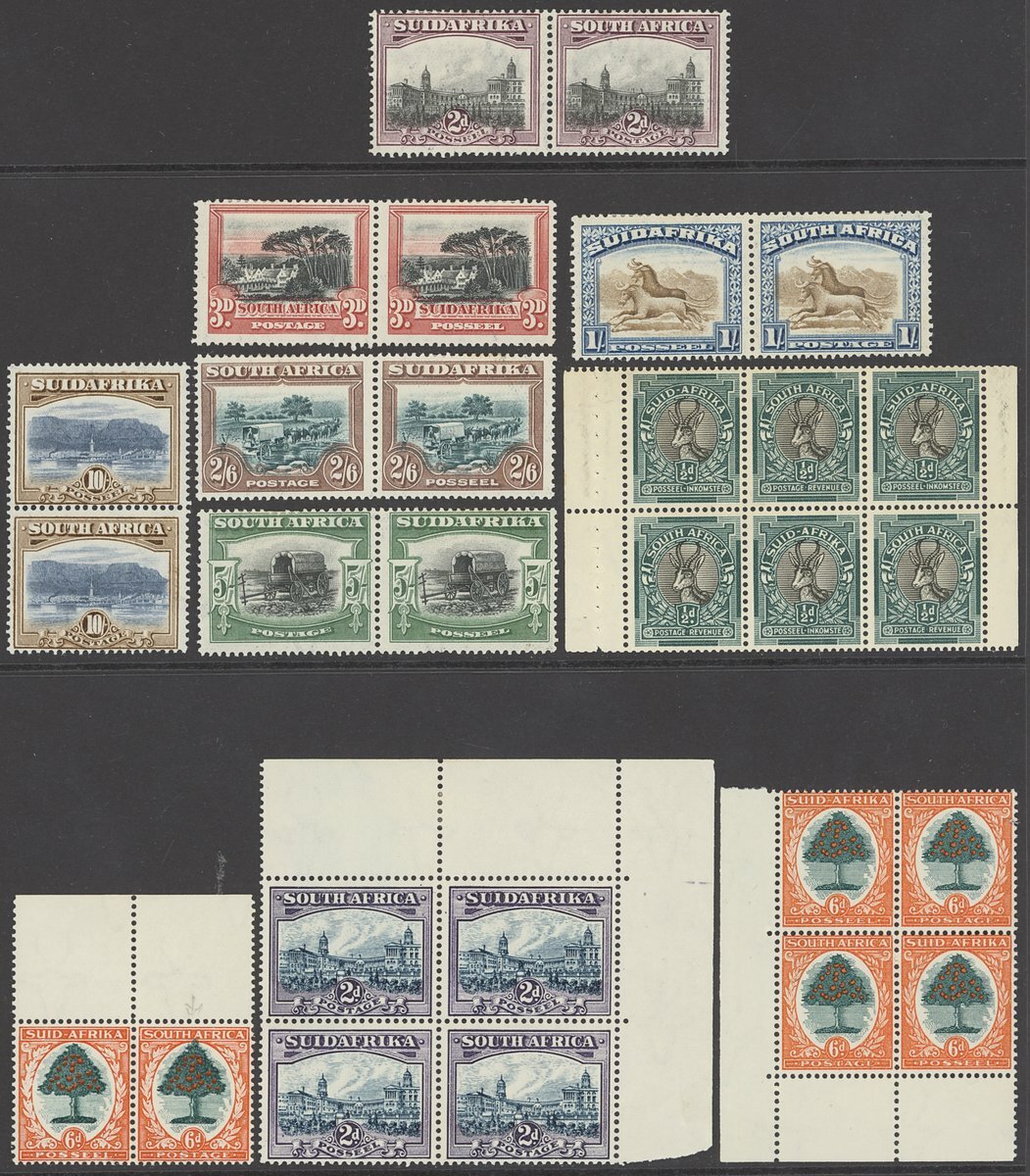 1927-30 Pictorial set (except 4d.) in bilingual pairs (10/- vertical), 1933-38 2d. blue and violet (block of 2 pairs), 6d. die I bilingual pair, 6d. die II (block of 2 pairs), 1937-40 ½d. booklet pane of six, unmounted mint or original gum; chiefly fine