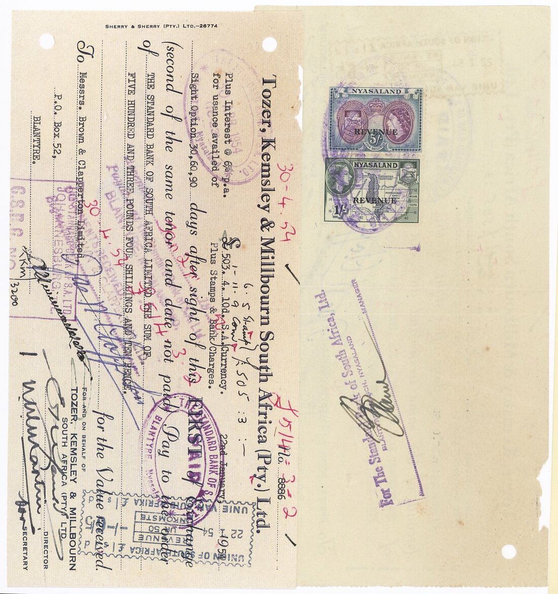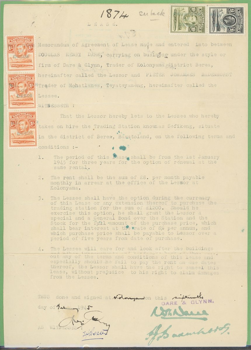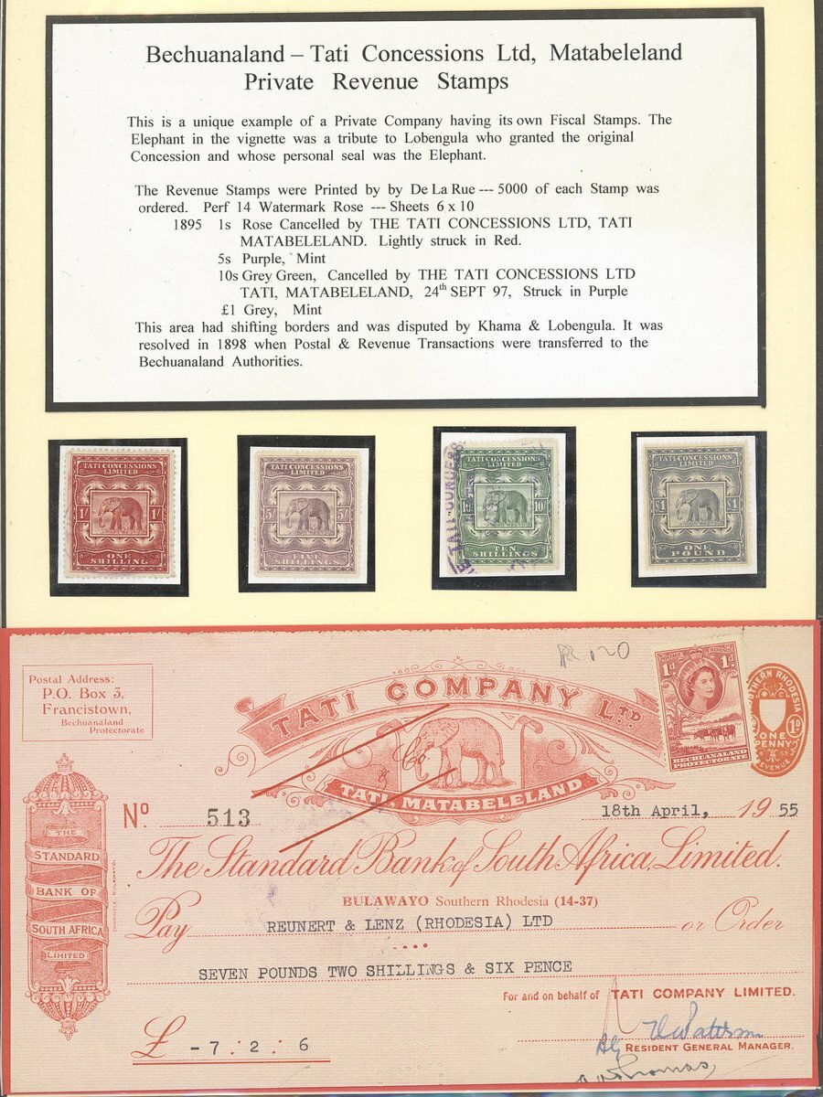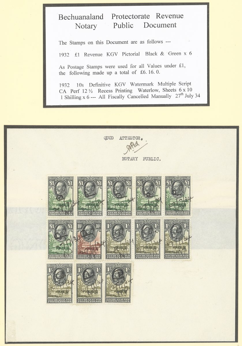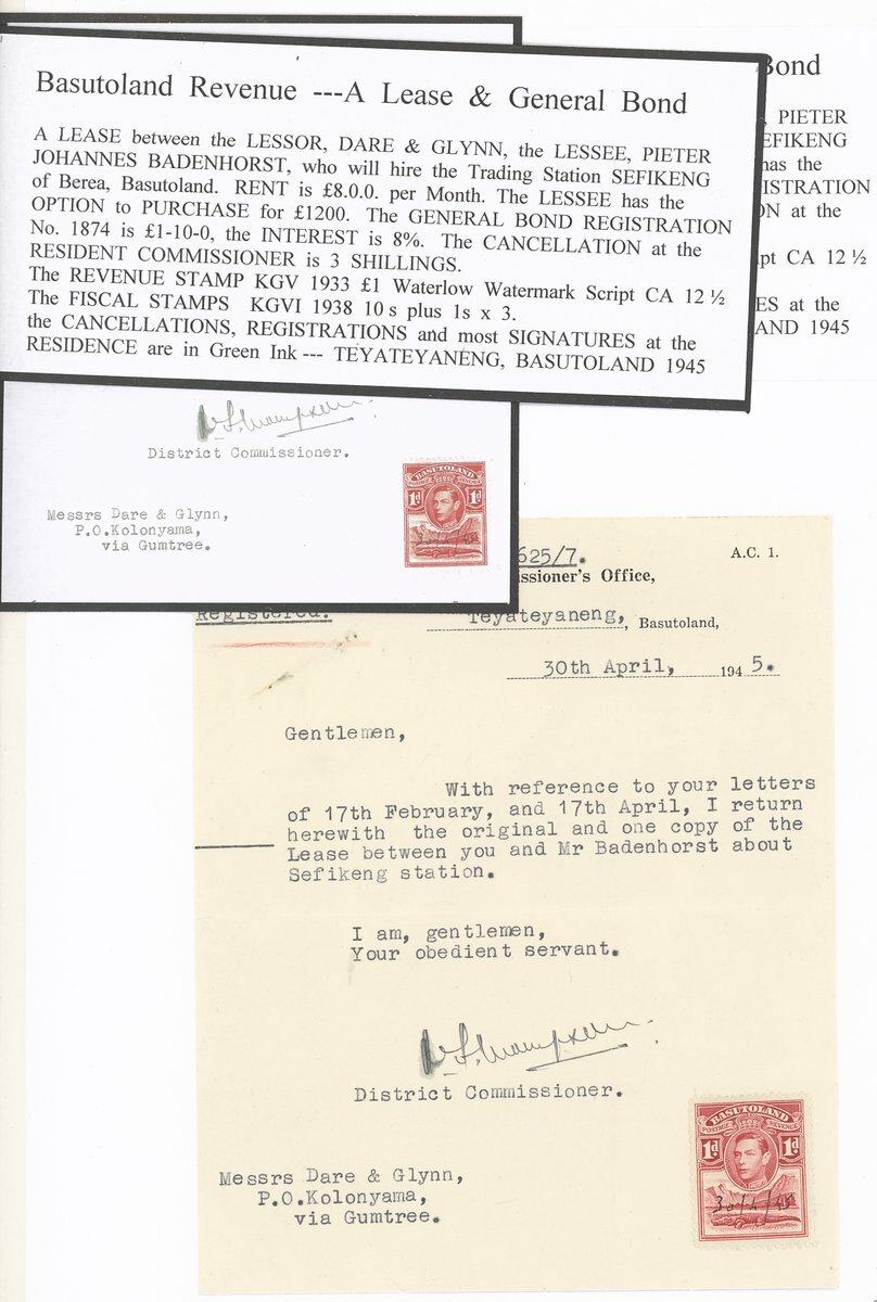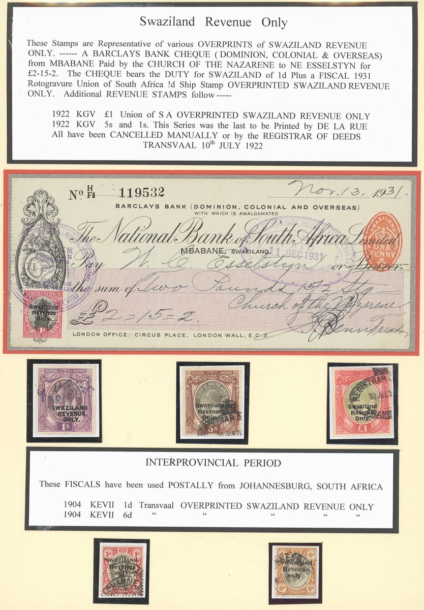 Bechuanaland, Tati Concessions 1/- and 10/- used, 5/- and £1 unused, 1934 public notary document paid with 1932 'L' shaped £1 block of six , 10/- 1/- strip of three, pair and single, all pen cancelled; Basutoland 1945 lease bearing 1933 £1 revenue, 1938 10/- and 1/- strip of three; Nyasaland 1954 Cheque with 1953 1/- and 5/-; Swaziland 1904 1d. and 6d., 1922 1/-, 5/-, £1 all overprinted "