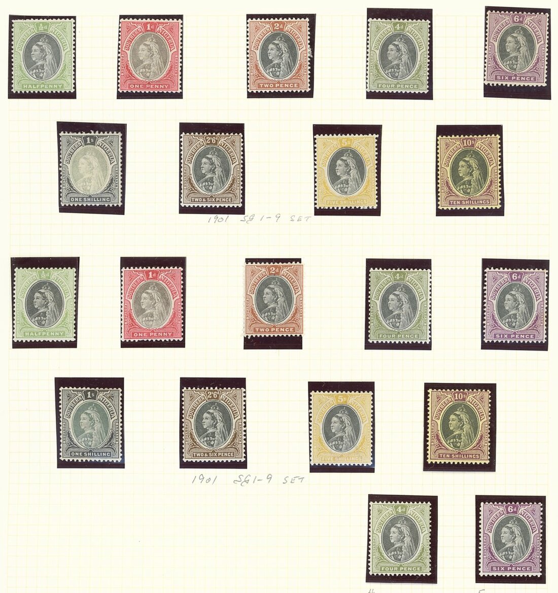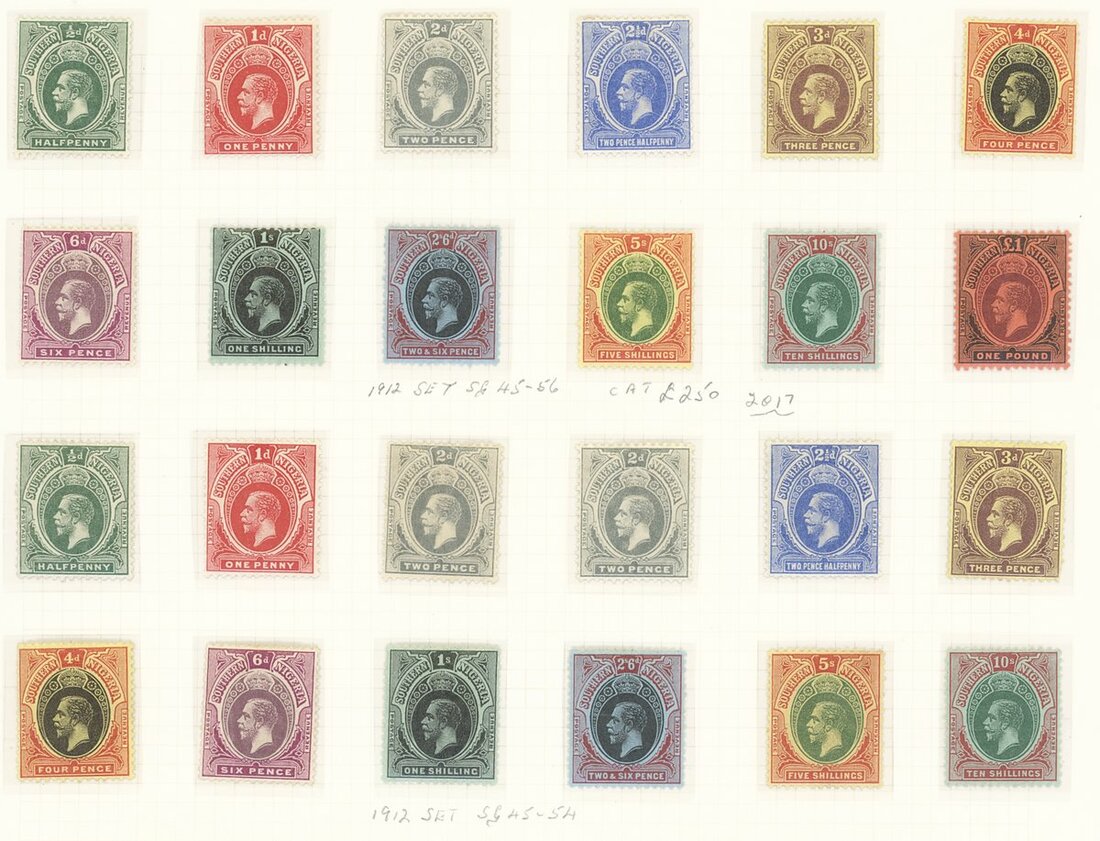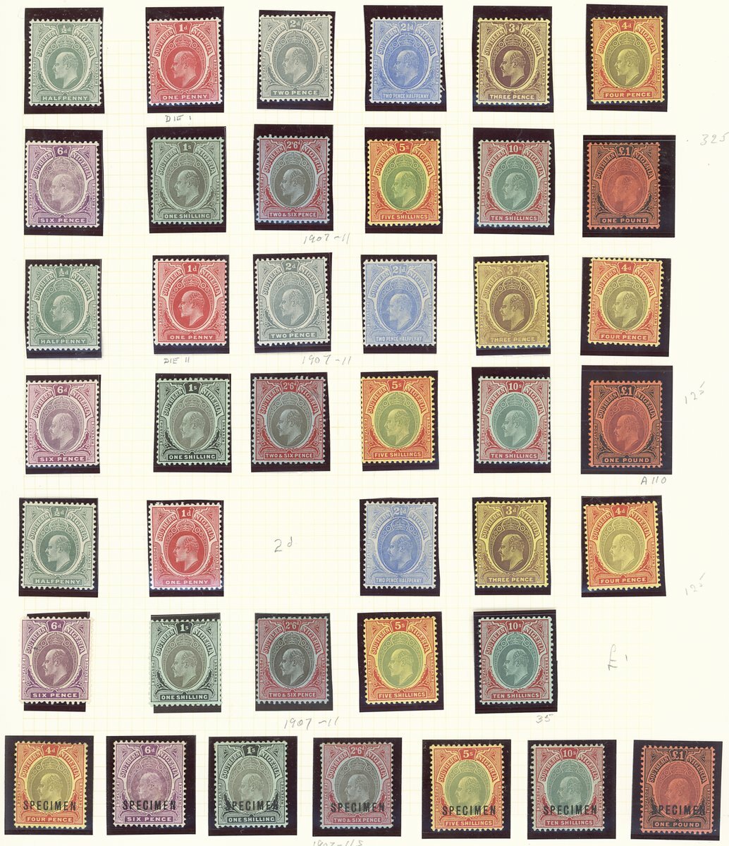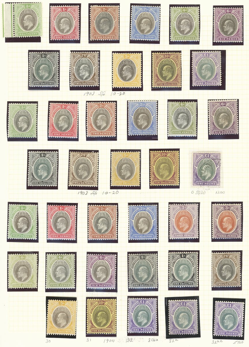 1901-12 mint group on pages including 1901 set of nine to 10/- (two sets), 1903-04 CA set to 10/- mint and with £1 used, 1904-09 set to 31 including all three £1 values mint, 1907-11 set of twelve to £1 (two complete sets and some duplication) and 4d. to £1 overprinted