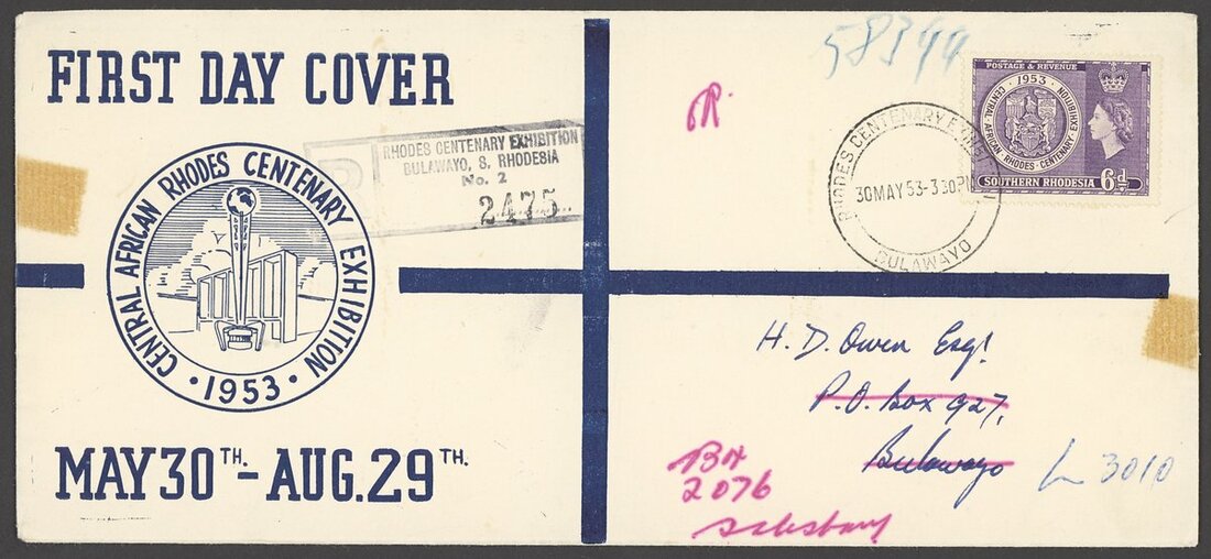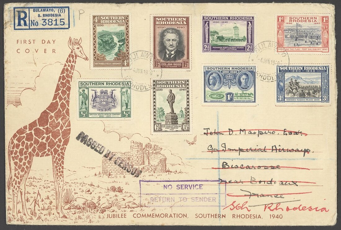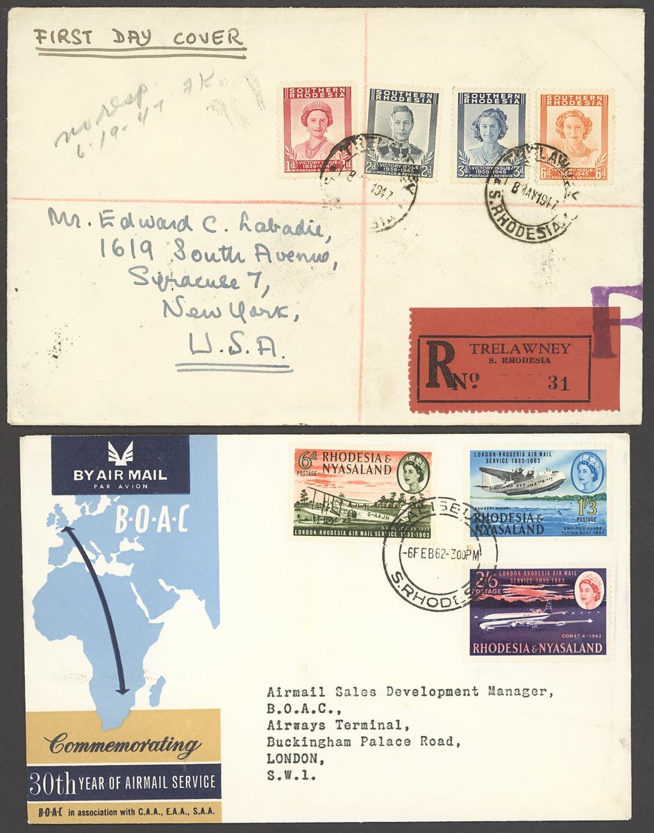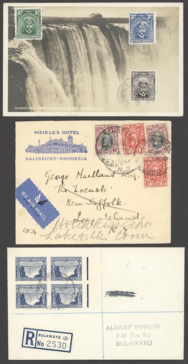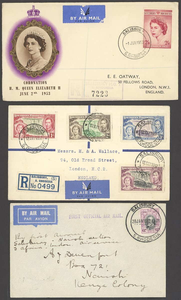 1925-62 covers/cards (39) including two cards bearing 1924-29 values, 2/6d. on 1926 with Department of Lands Revenue piece and 1d. unused letter card, 1931-37 covers (7), 1932 covers (2) and 3d. on Revenue receipt, 1937 Definitives (8, two with censor cachets), 1942 R.A.F. OAS envelope (faults) from Guinea Fowl, and a range of later first day covers including 1940 BSAC large illustrated type with "