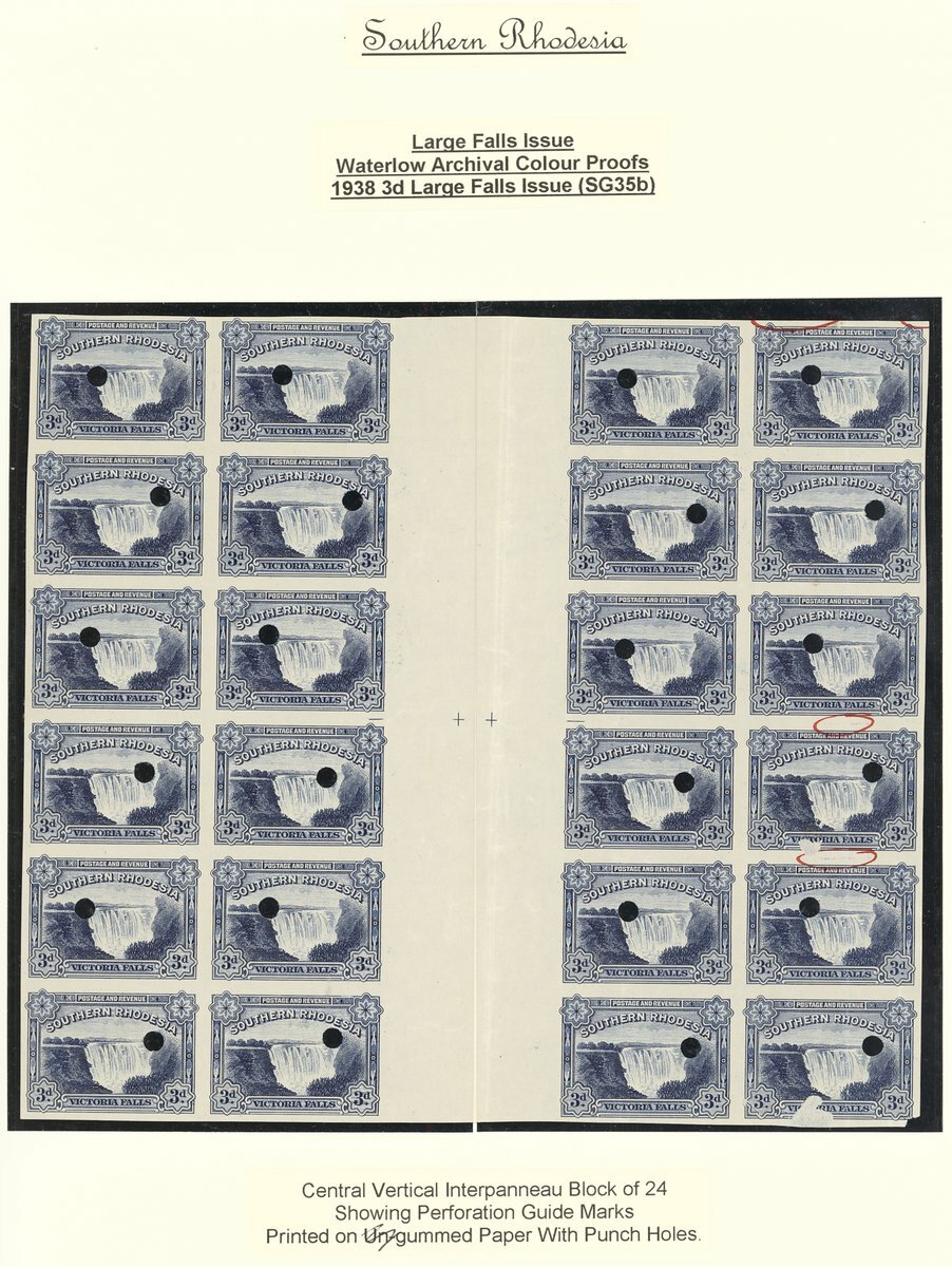 1935-41 Large Falls 3d. deep blue printer's imperforate plate proof interpanneau block of twenty-four (4x6) showing guide crosses at centre and with three stamps ringed for plate correction, each stamp with 4½mm. puncture; vertical crease at centre and lower right stamp with surface faults though an attractive multiple