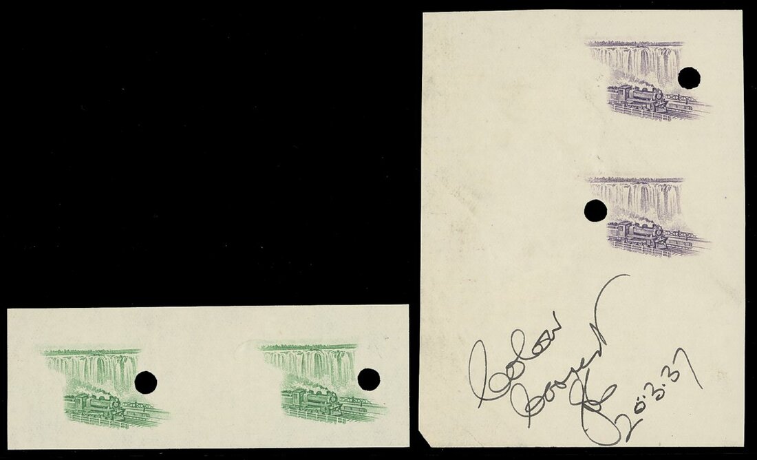 1937 Coronation 2d. emerald and 3d. violet vignette imperforate plate proof pairs on gummed paper, the 3d. vertical from the lower left corner marked "Colour Correct", initialled and dated "20.3.37", each with a 4½mm. puncture; fine