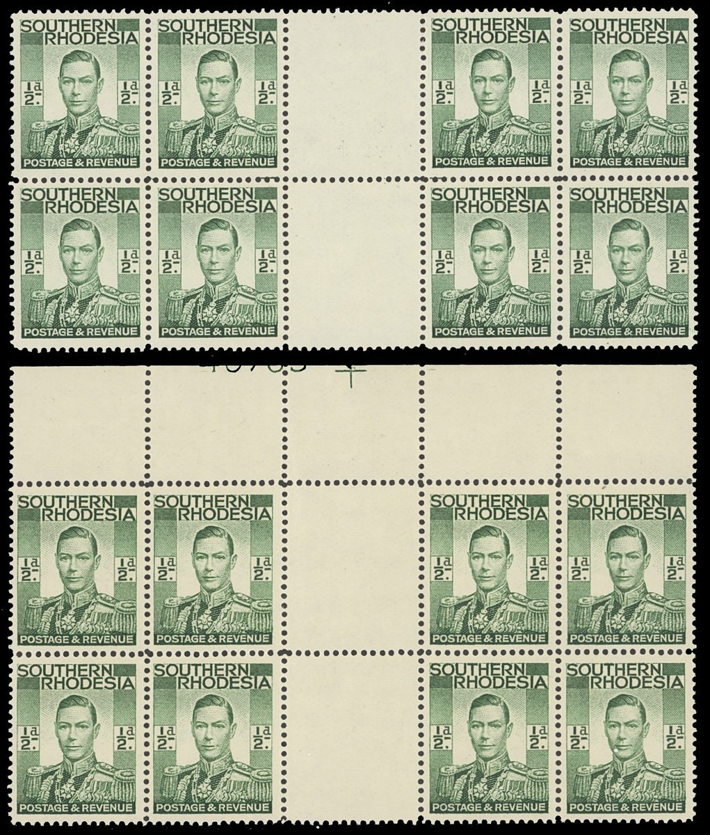 1937 ½d. interpanneau blocks of eight (2) one with part plate number and small cross (rare and possibly unique) the other with imprint, fine unmounted mint. S.G. 40