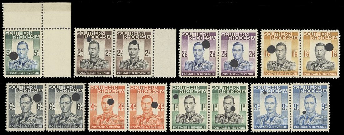 1937 4d., 6d., 9d., 1/-, 1/6d., 2/- and 2/6d. pairs, and 5/- upper right corner single, all perforated proofs from the printer's file sheets and with a single 4½mm. puncture; fine