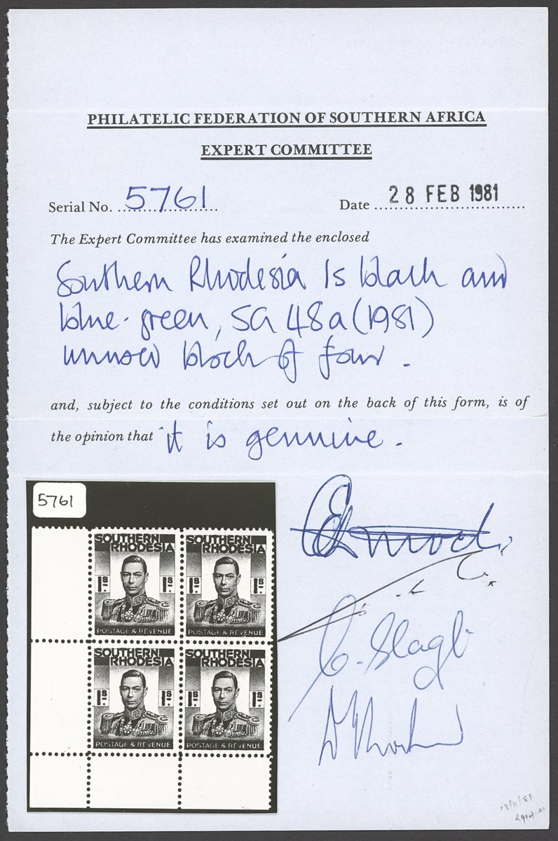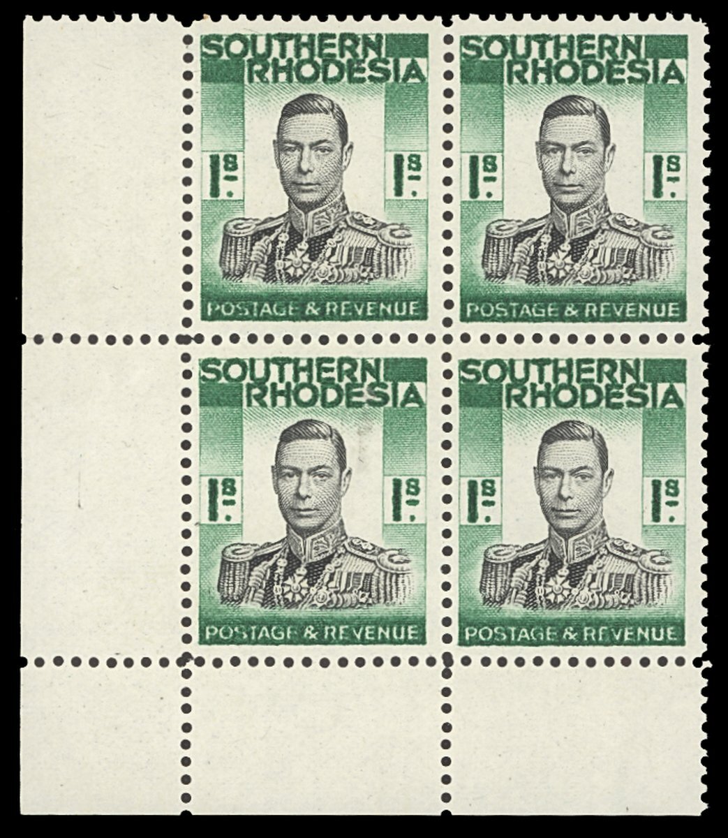 1937 1/- black and blue-green lower left corner block of four, variety frame double, one albino, fine unmounted mint. A very rare multiple and from the third sheet recorded in Memoir 21. PFSA Certificate (1981). S.G. 48a, £15,000+