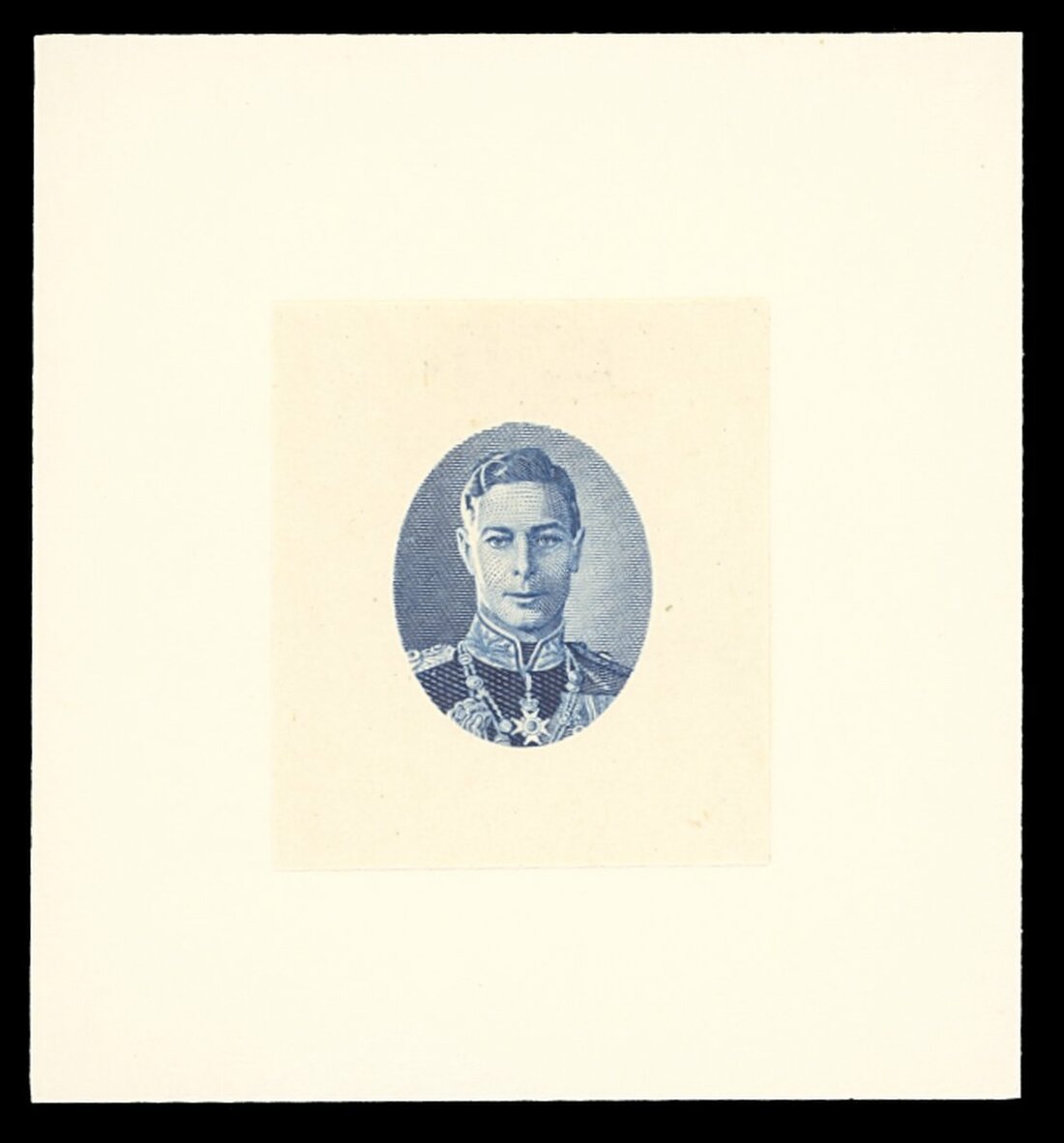 1940 (June) Golden Jubilee 1/- King George VI portrait die proof in a design very similar to that used though slightly larger and showing more details from the neck down, in blue in oval surround on wove paper (26x30mm.) affixed to thin card (52x56mm.). Highly attractive and very rare