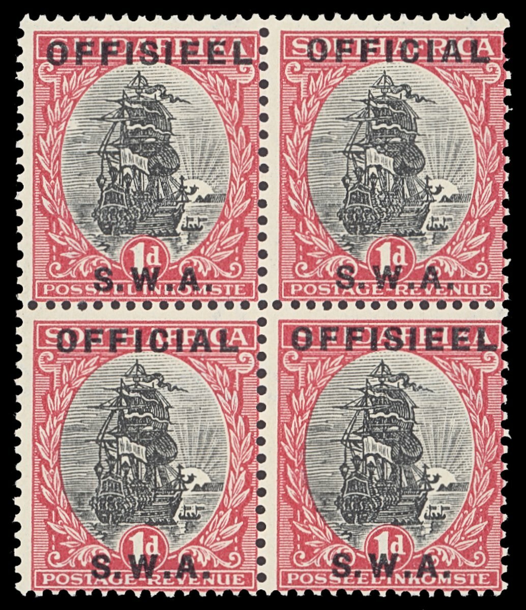 1929 1d. black and carmine, block of four (two bilingual pairs) with watermark inverted, original gum; centred a little to right, fine and fresh. S.G. O6a, £1,000+.