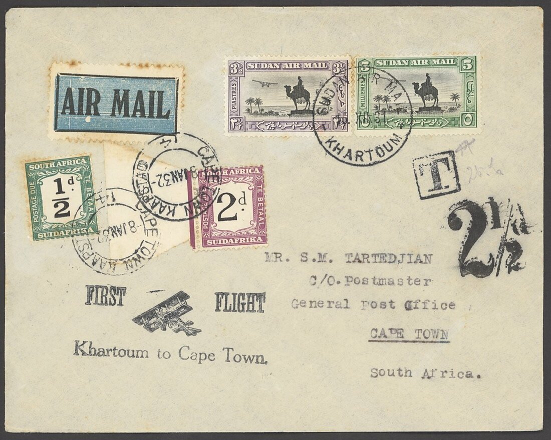 1931 (15 Dec.) envelope to Cape Town franked 1931-37 Air 5m., 3½p., "First Flight/Khartoum to Cape Town." cachet, on arrival taxed by South African ½d. and 2d. Postage Dues; some small stains but scarce