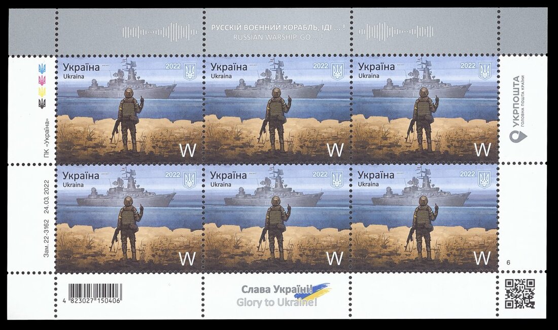 2022 "Russian Warship go ... !" "Glory to Ukraine!" W stamp miniature of six (3x2) numbered '6' in the lower right corner unmounted mint, very fine.