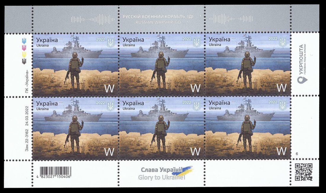 2022 "Russian Warship go ... !" "Glory to Ukraine!" W stamp miniature of six (3x2) numbered '6' in the lower right corner unmounted mint, very fine.