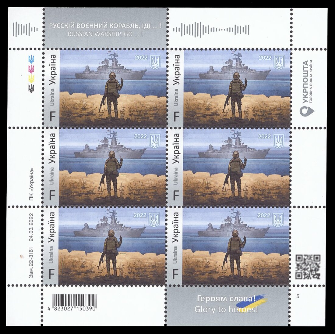 2022 "Russian Warship go ... !" "Glory to Ukraine!" F stamp miniature of six (2x3) numbered '5' in the lower right corner unmounted mint, very fine.