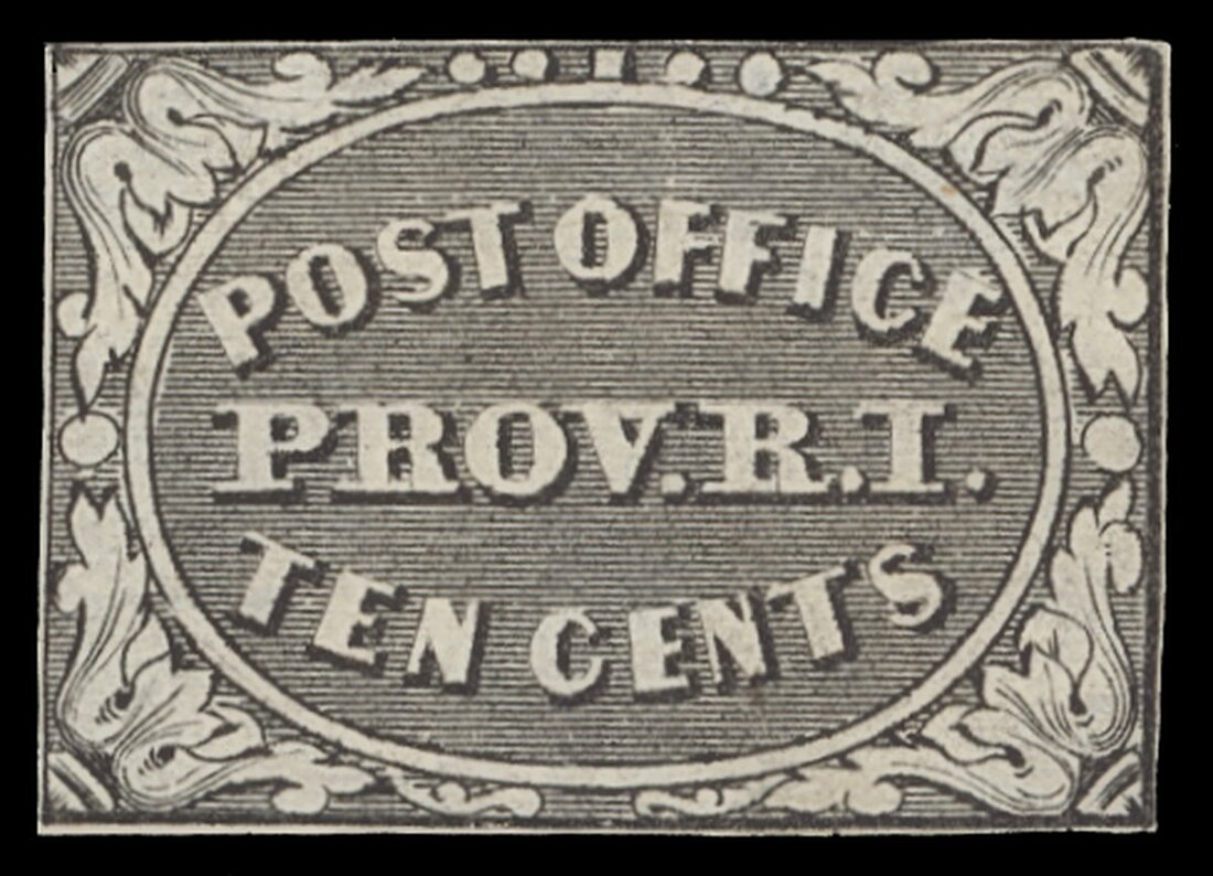 1846, 10c grey-black Rhode Island, unused, without gum, close margins just touching at top, fine. P.F. Certificate (20020. (Sc. 10X2, $700)