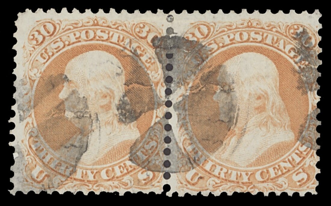 1861-2, 30c orange horizontal pair, multiple neatly struck fancy cancels, the odd short perf at bottom, fine. (Sc. 71, $550)