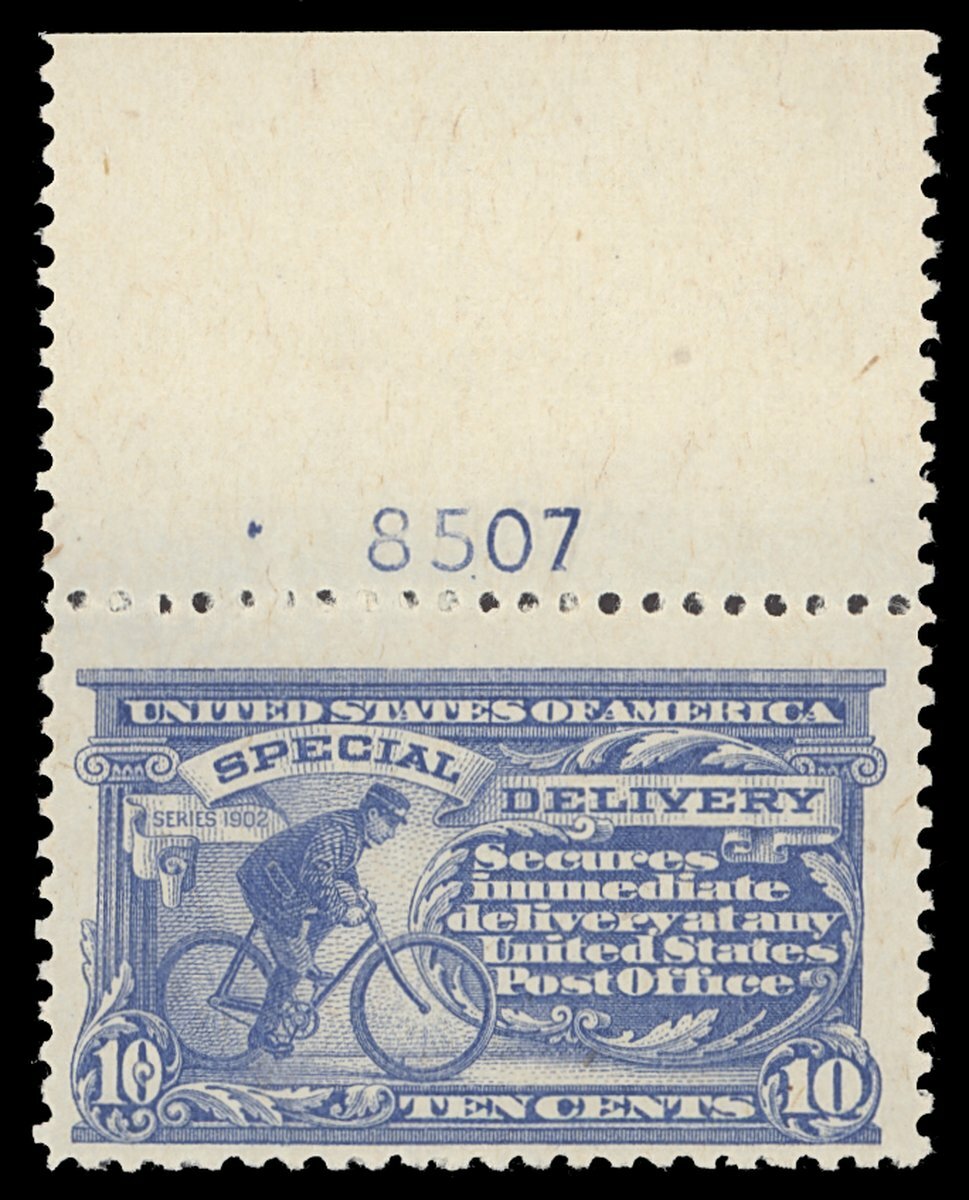 1902, 10c ultramarine Special Delivery, never hinged, plate margin single (8507), trivial dulled spot on gum mentioned for strict accuracy, fine-very fine. (Sc. E6, $500+)