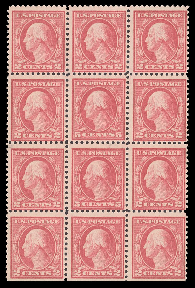 1917-19 5c rose error in block of twelve, the two 5c error stamps in middle, those never hinged, a few other 2c examples with gum adhesions, scarce and fine. (Sc. 505, $1,200 as hinged)