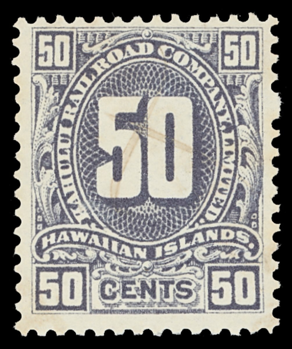 1894, Kahului Railroad, 50c purple, American Bank Note Co. printing, light manuscript cancel, good colour, nicely-centered, a pleasing example of this scarce revenue, fine; ex-Wells Fargo Express. (Meyer-Harris 155)