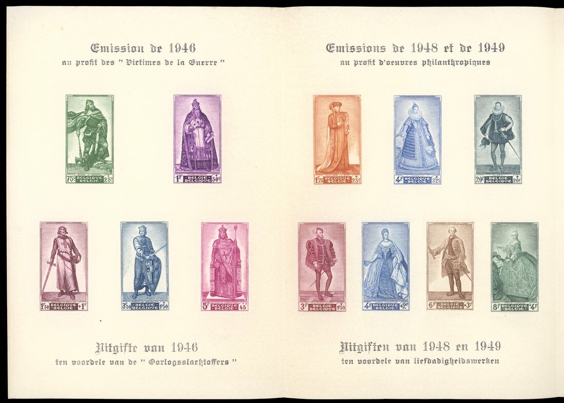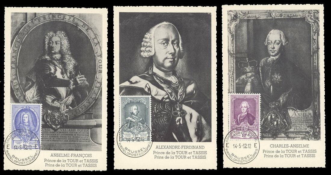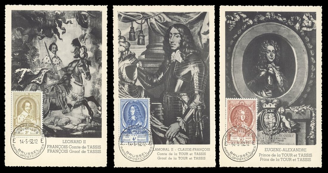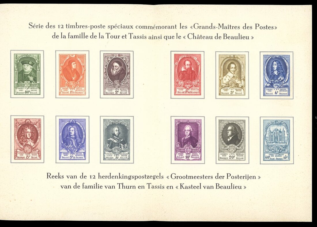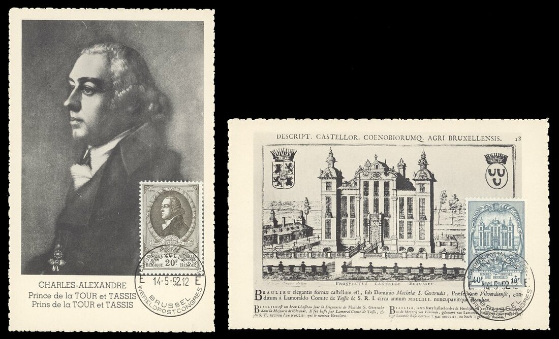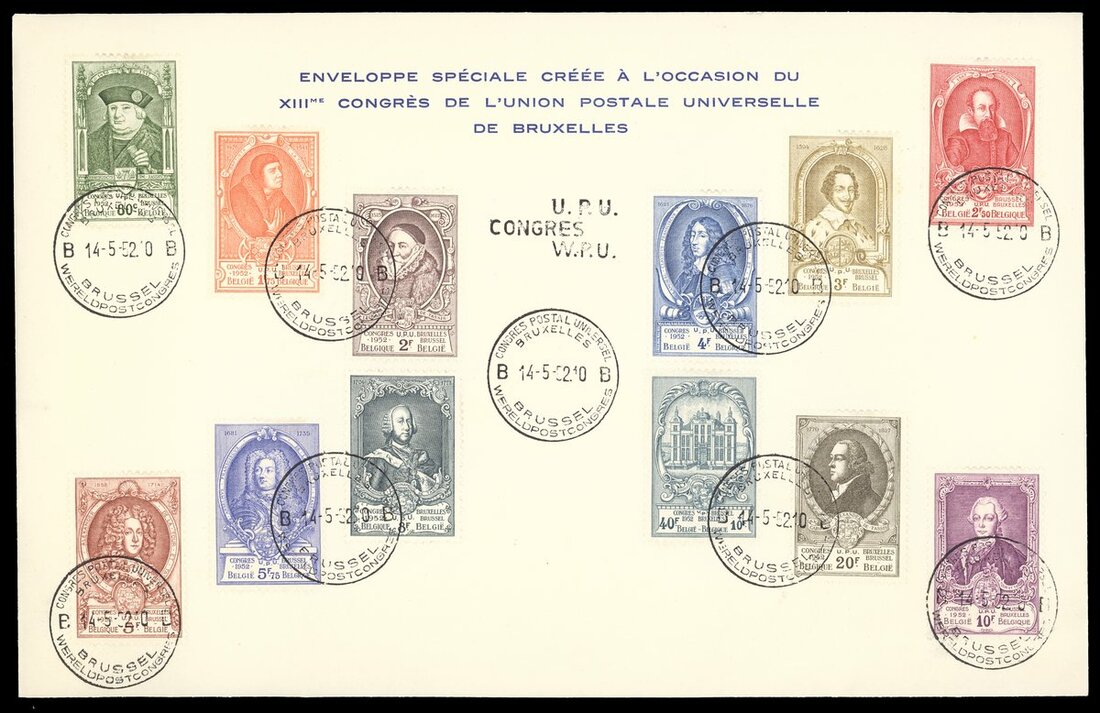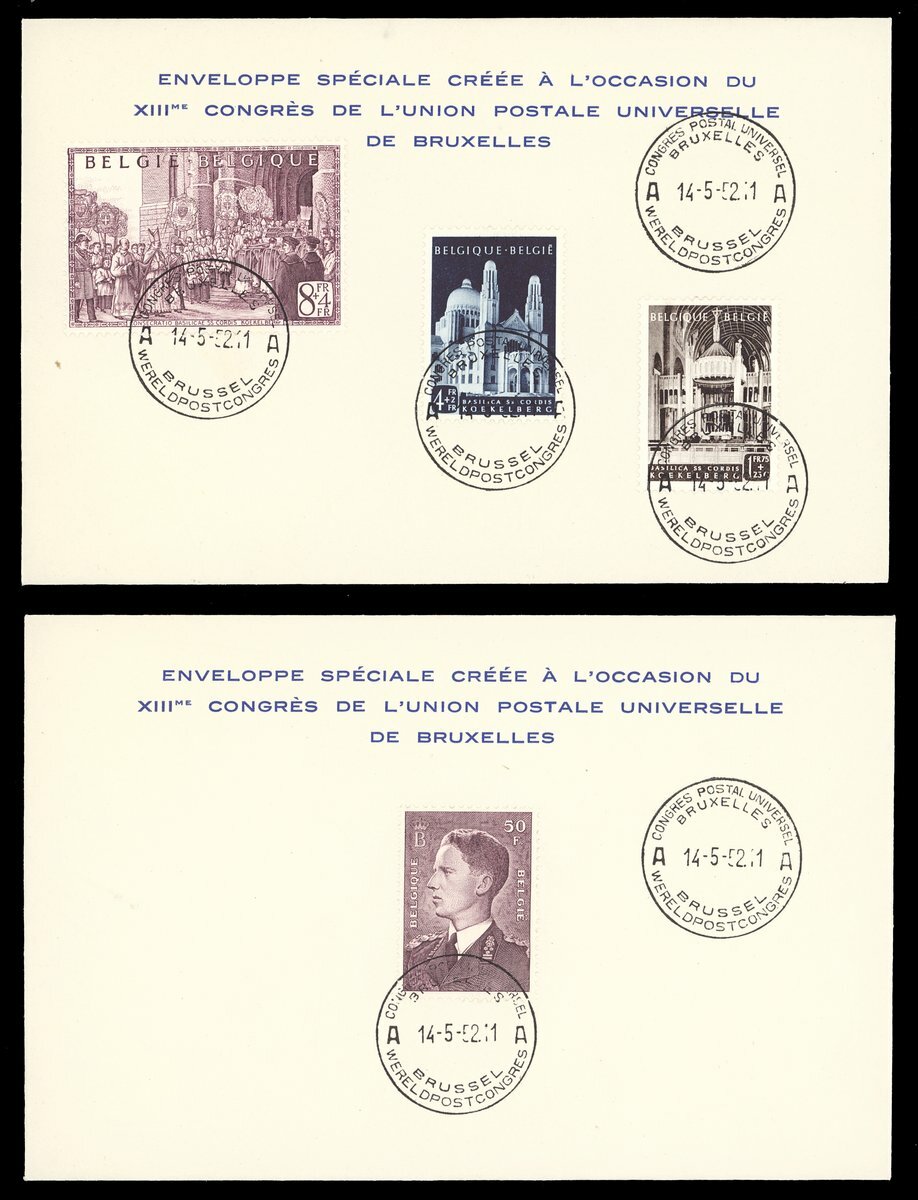 Belgium: 1952 Brussels, a selection (not in a booklet), including folders with printed impressions of 1946, 1947, 1938-49 War Victims (in one folder), 1952 Koelkelberg Basilica, 1952 Baudouin 50f. with 1952 U.P.U. set, also 1952 Koekelberg set (3 on FDC's), 1952 Baudoiun 50f. (2 on FDC's), 1952 U.P.U. set of FDC, set on 12 maximum cards and another set cancelled in a souvenir booklet; fine