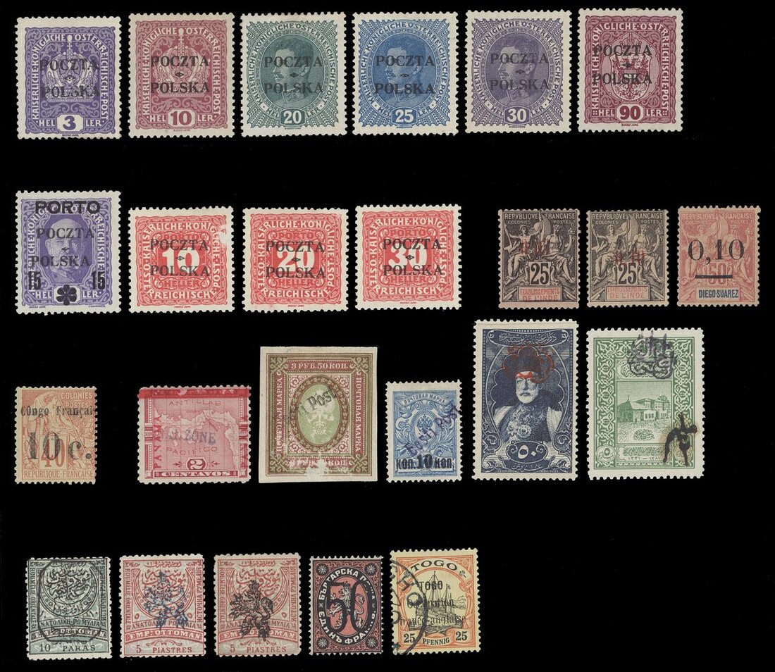 Collector selection (24) on three stockcards comprising genuine and forgeries including Poland, French Colonies, Estonia, Canal Zone etc. Two P.F. Certificates included for a East Rumelia 1885 5p. mint and Togo 1914 25pf. used. Mixed condition, a lot with potential.