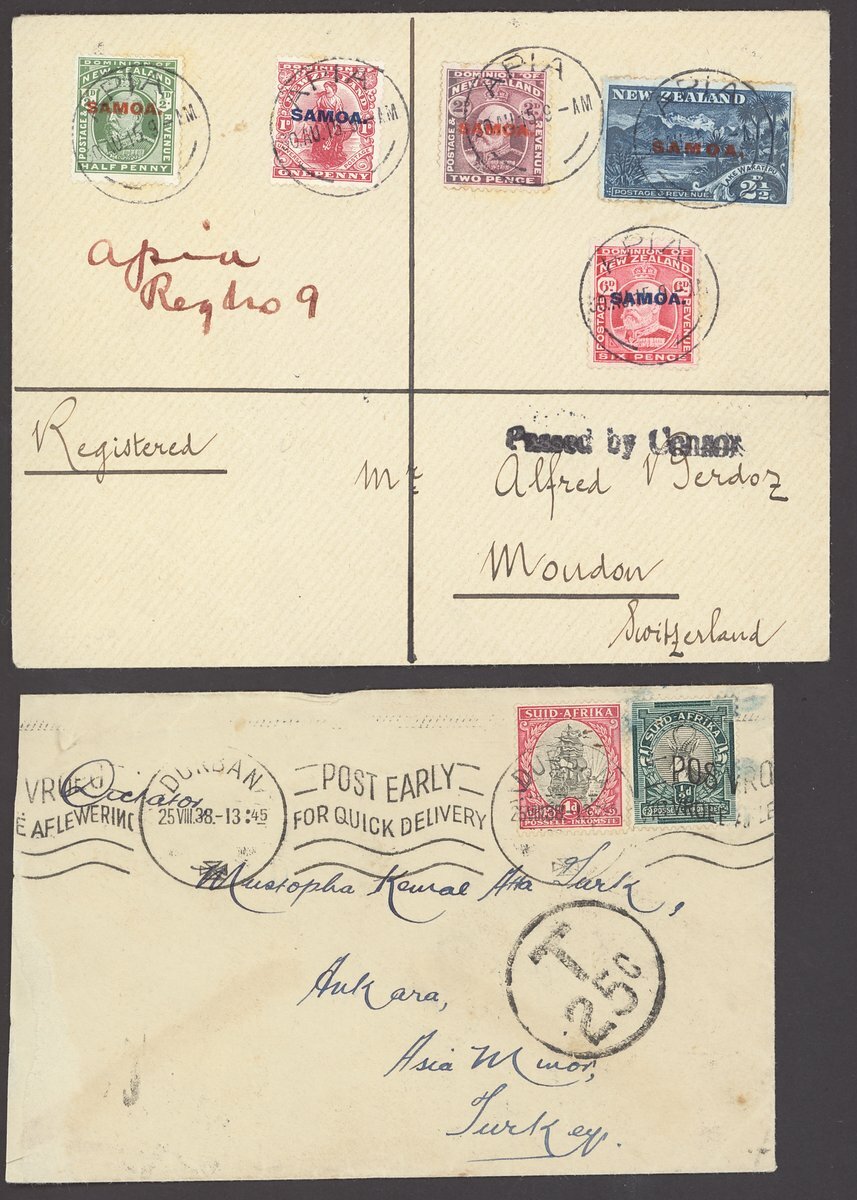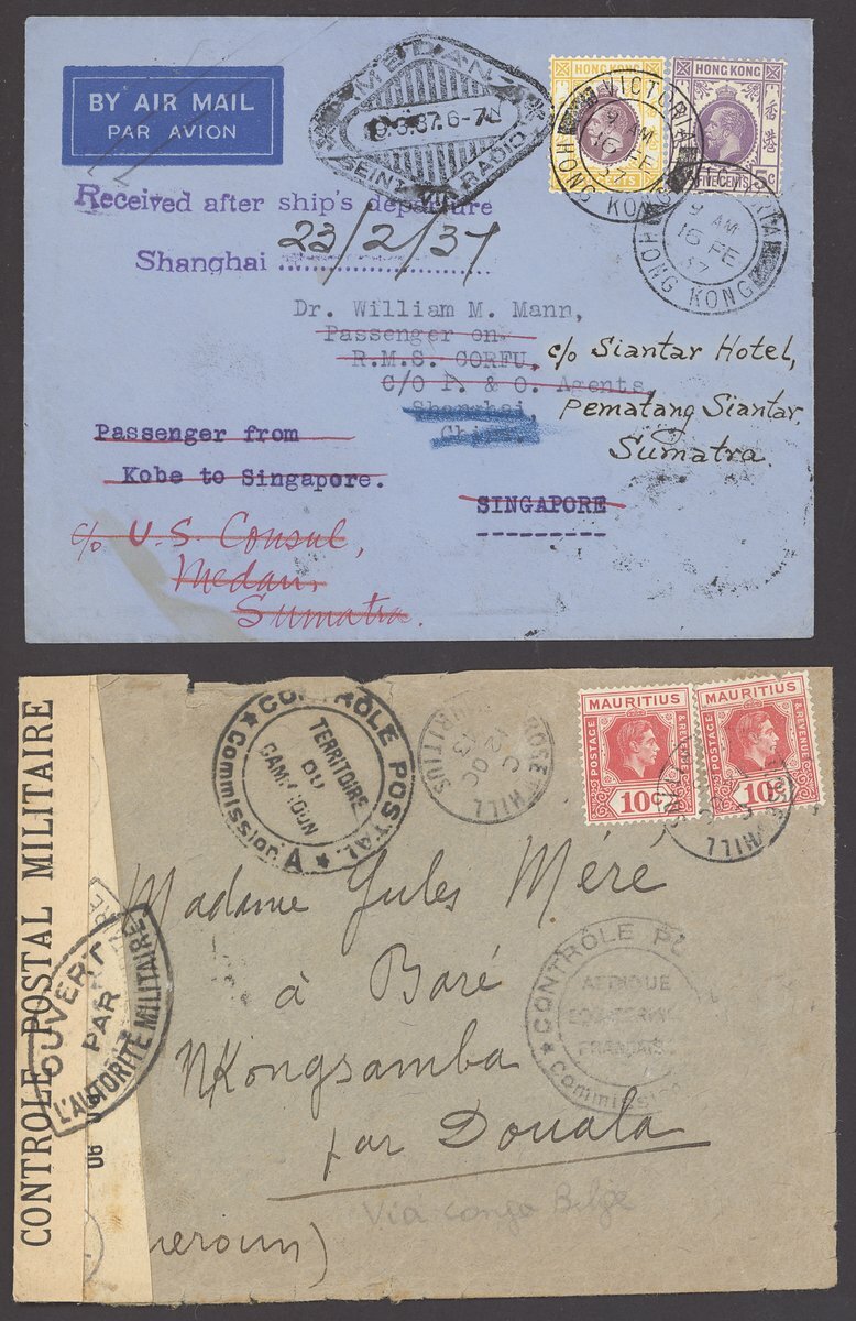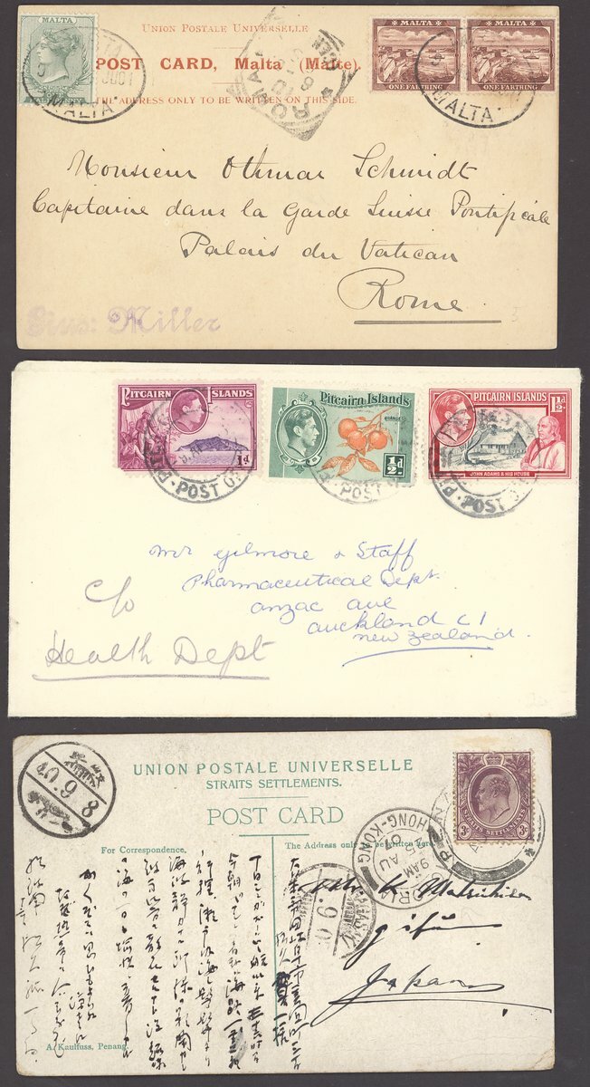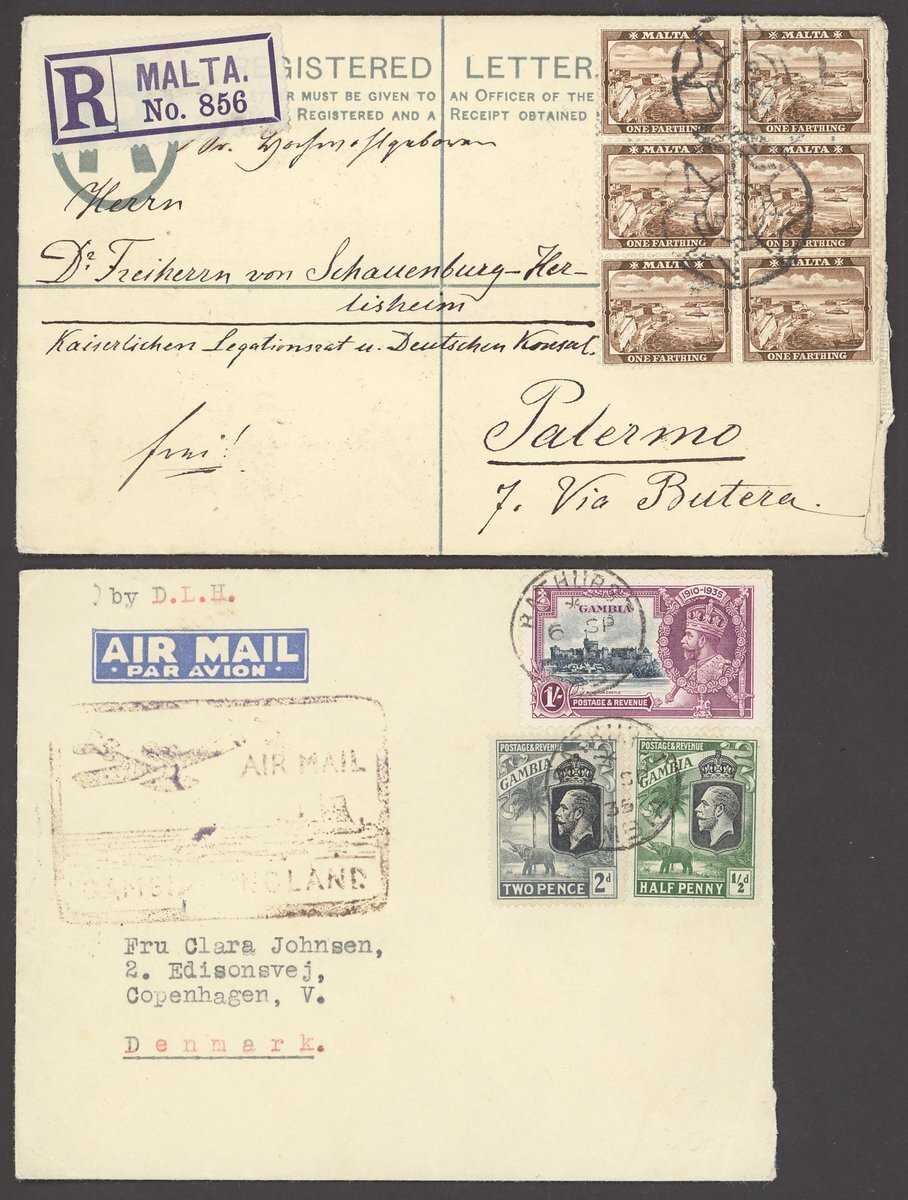 British Commonwealth selection of thirteen covers or cards, including Gambia 1932 Air Mail cover to Denmark franked ½d., 2d., 1935 1/-, Hong Kong 1937 Air letter to Singapore franked 5c., 30c. and with "Received after ship's departure" cachet, Malta 1901 p.p.c. to the Vatican franked ¼d. (2), ½d., 1911 2d. registered postal stationery envelope additionally franked ¼d. blocks of four and six, Mauritius 1943 censored cover to Douala, Pitcairn Islands,Rhodesia and Nyasaland 1959-62 ½d. to £1 (14 values) on long cover Registered to Canada, Samoa 1915 cover Registered to Switzerland franked ½d., 1d., 2s., 2½d. and 6d., etc., chiefly fine