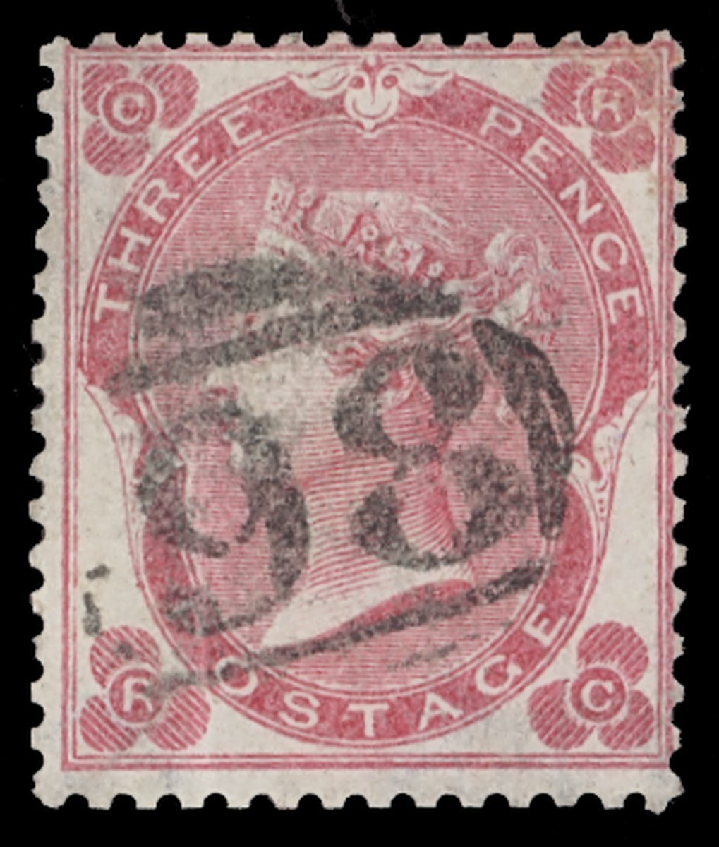 RC, 3d. deep carmine-rose, variety watermark inverted and reversed, cancelled by barred numeral, pressed vertical crease at left otherwise fine and rare, unlisted by Gibbons. B.P.A. Certificate (2021). S.G. 76var