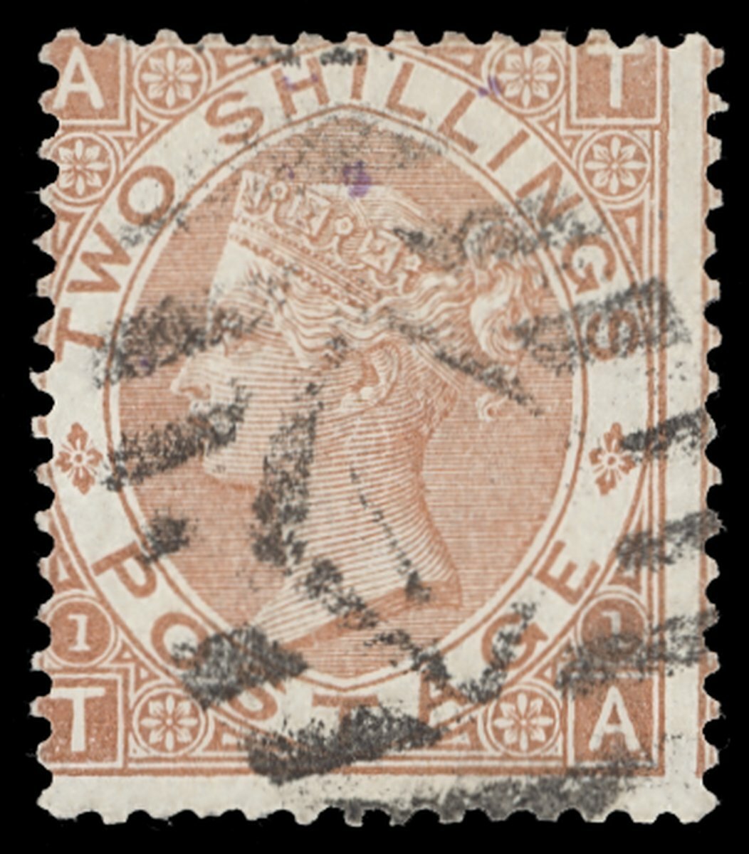TA, 2/- brown, variety watermark inverted, cancelled by indistinct barred numeral, traces of violet cancel at top though a fine example of this very rare variety. R.P.S. Certificate (2009). S.G. 121wi, £6,000