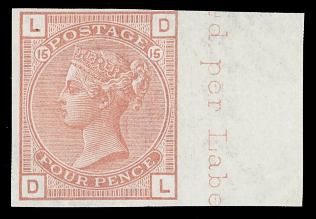 Plate 15: DL 4d. imperforate colour trail in pale orange-brown, marginal from the right of the sheet with part inscription "ed. per Labe", large part original gum, fresh and fine