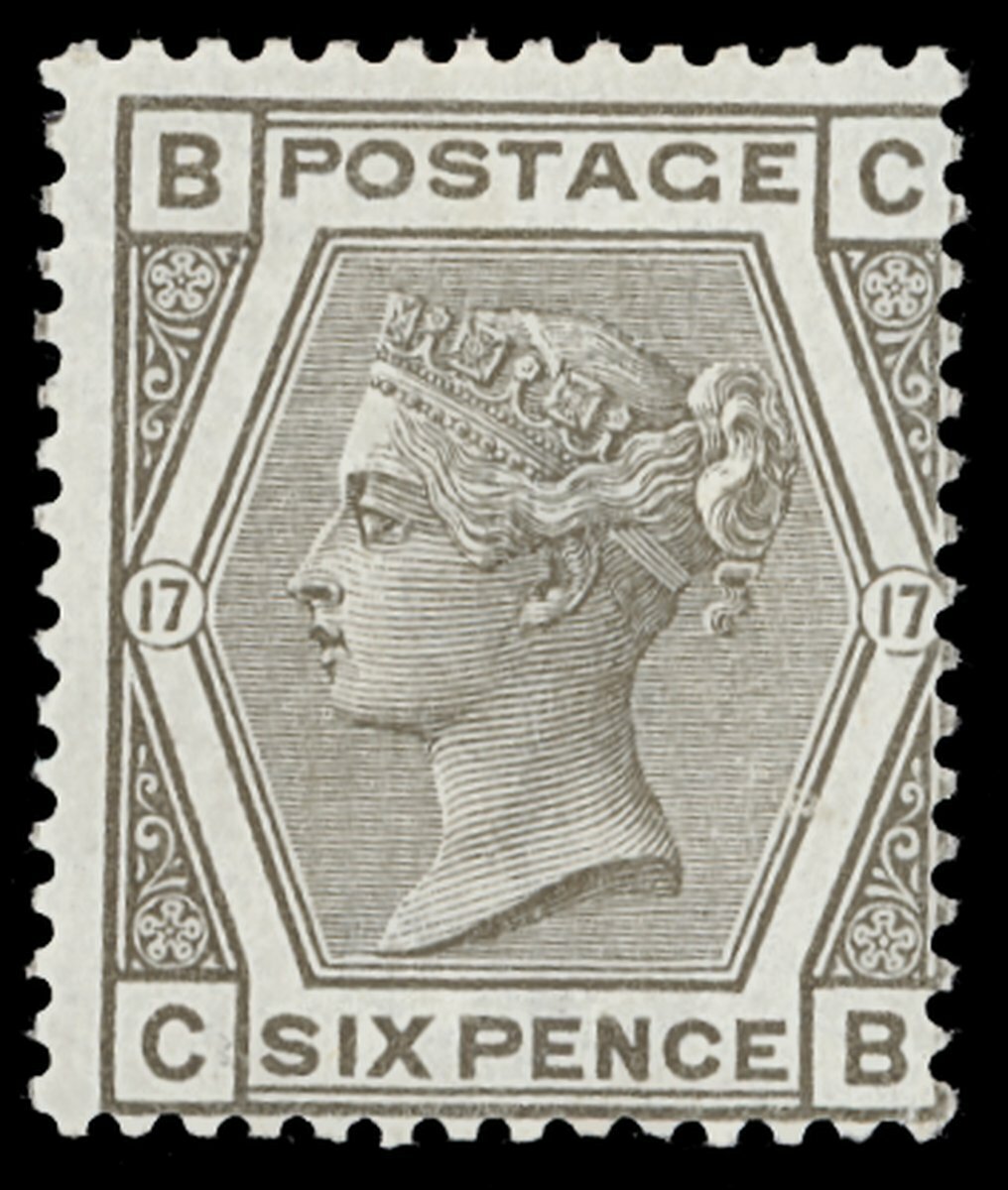 Plate 17: CB, 6d. grey, large part original gum, a few minor wrinkles though a fine example of this scarce plate. S.G. 147, £950