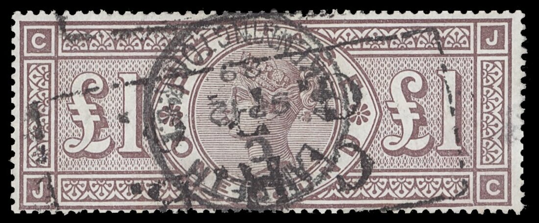 £1 brown, JC, cancelled by 'Lambeth' c.d.s.and boxed Telegraph cancel, variety frame broken, visible at lower right, tiny corner bend at lower left, otherwise fine and a very difficult variety. S.G. 186a, £7,500