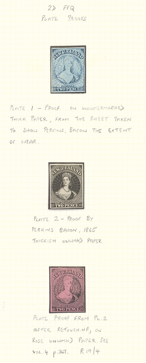 2d. Plate Proofs; three examples, the first from Plate 1 in blue on thick paper, from the sheet taken to show Perkins Bacon the extent of the plate wear, the second from Plate 2 in black on thickish paper and the third from Plate 2 after retouching in black on thick rose paper [19/4 retouch]; a fine group