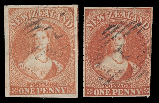 1d. orange-vermilion, large to very large margins with part of adjoining stamp visible at right and 1d. carmine, clear margins on three sides and cut-into at right, both cancelled "1" at Auckland. S.G. 33, £600, CP A1c, $1,400