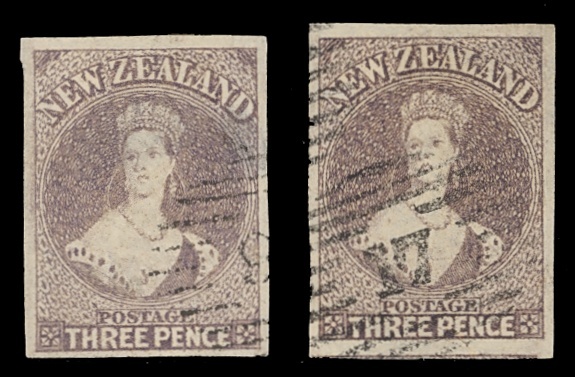 3d. brown lilac and 3d. deep brown-lilac, both with four margins and clear cancellations; the former with large thin at right, the latter fine. S.G. 40 group, £400, CP A3a, $650+