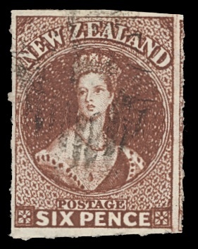 6d. red-brown, roulettes visible on all four sides, part of adjoining stamp visible at right; cancelled by indistinct barred oval, fine. R.P.S.N.Z. Certificate (1996). S.G. 55, £475; CP A5b (v), $1,500