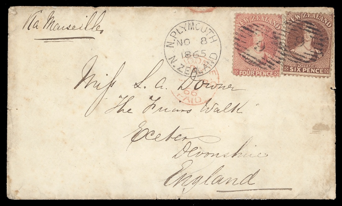 1865 (8 Nov.) envelope from New Plymouth to Exeter, bearing 4d. deep rose and 6d. red-brown each clearly cancelled "9" and with dispatch c.d.s alongside with London Paid c.d.s. (12.1) below, Exeter c.d.s. (13.1) on reverse; the envelope with some soiling though scarce and not unattractive. S.G. 119, 122