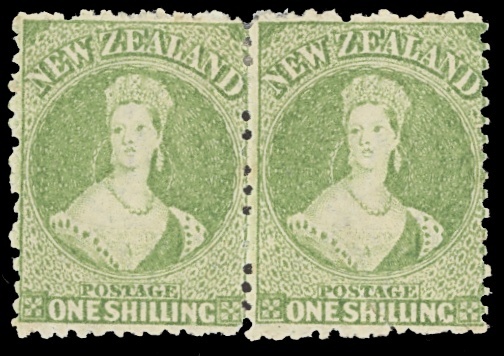 1/- yellow-green, horizontal pair with large part original gum; fine and fresh appearance. S.G. 125, £700+; CP A6m, $1,600+