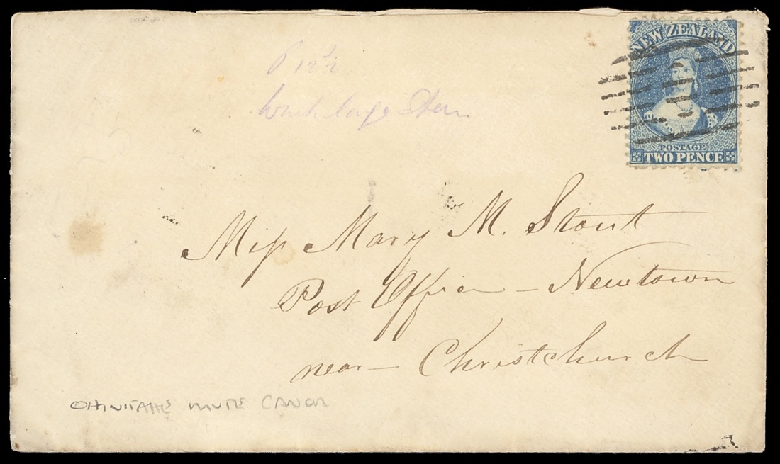 1870 (4 Jun.) envelope from Ohinitahi to Post office Newtown near Christchurch, bearing 2d. blue, plate II, tied by the Ohinitahi mute cancellation; the postmaster had been authorised to manufacture his own cancellation of bars and an unframed circular datestamp (on reverse); scarce and a fascinating item of postal history