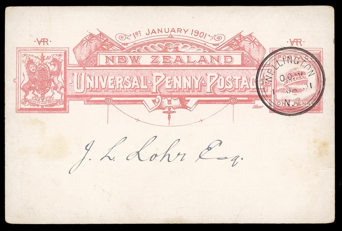 1902 (1 Jan.) Postmaster-General J. G. Ward's printed postcard ushering in the Universal Penny Postage sent locally from G.P.O. Wellington and with
