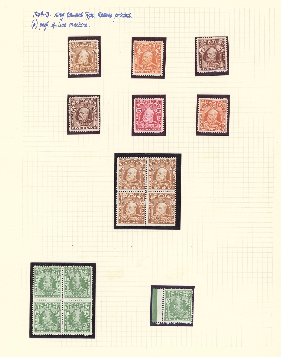 1909-16 mint group on album pages comprising 1909-1 comb perf. 14 x 15 ½d. single and block of four, 1909 comb perf. 12 x 14½ set to 1/- with some shades and 4d. red-orange blocks of four (2, one from the upper right corner of the sheet with sheet number '13405'), line perf. 14 set to 1/- and with some multiples, 1915-16 comb perf. set to 8d. and 1916 provisional 8d. watermark sideways single, pair, and block of four; chiefly fine and fresh. S.G. 387-404, £1,000+