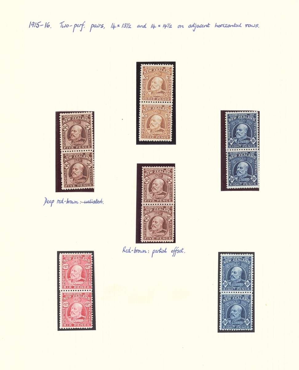 1909-12 vertical pairs, perf. 14 x 13½ and 14 x 14½ on adjacent rows, mint group comprising 3d. chestnut, 5d. deep red-brown, 5d. red-brown, 6d. carmine, 8d. indigo blue and 8d. deep bright blue (six pairs); lightly mounted mint. S.G. 401a-404ba group, £780+; CP $3,000