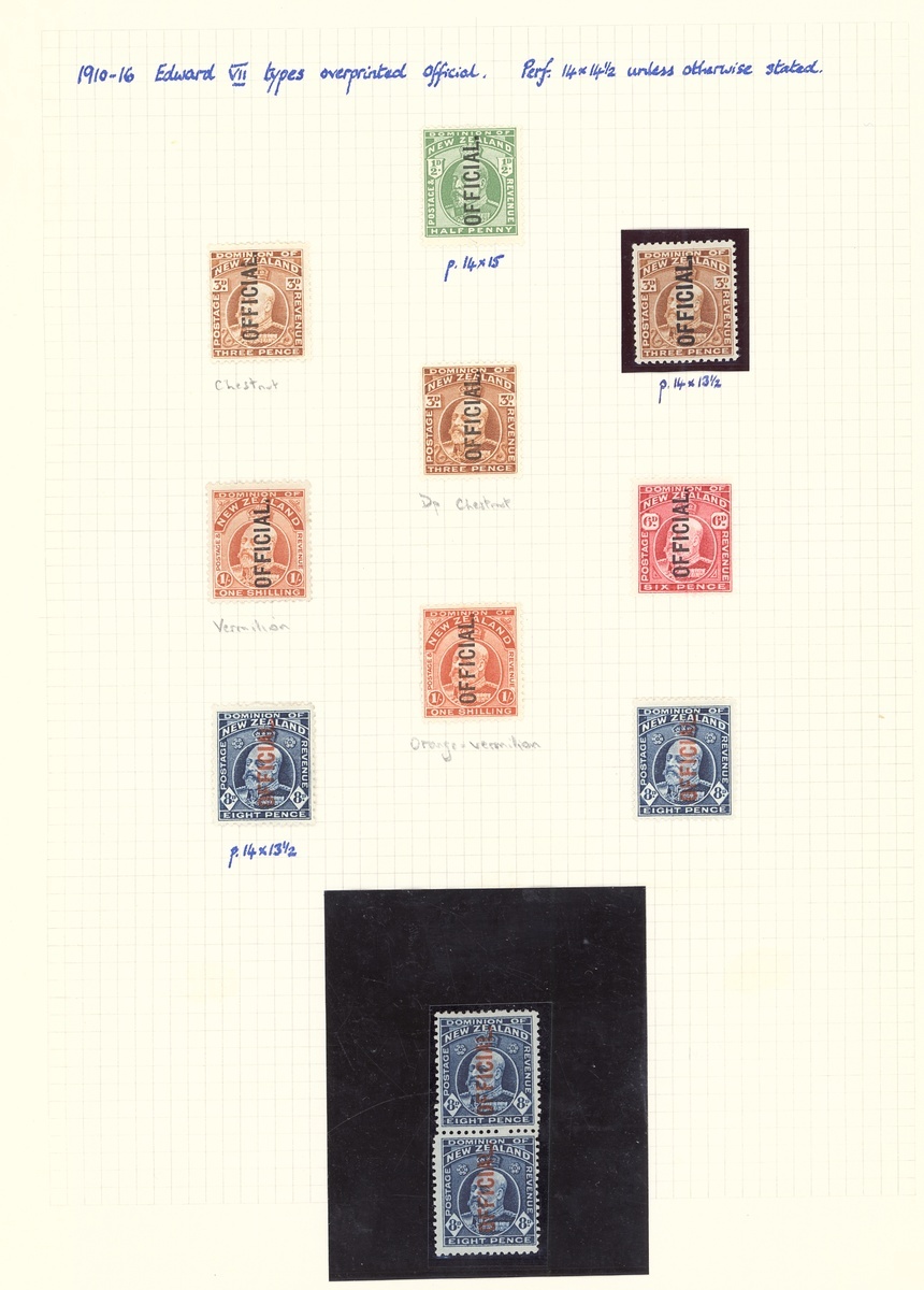 1910-16 group of Official overprints comprising perf. 14 x 15 ½d. green, 3d. chestnut, 3d. deep chestnut, 6d. carmine, 8d. indigo-blue (single and vertical pair), 1/- vermilion and 1/- orange-vermilion and perf. 14 x 13½ 3d. chestnut and perf 14 x13½ 8d. indigo-blue; chiefly fine. S.G. O73-O77 group, £400+