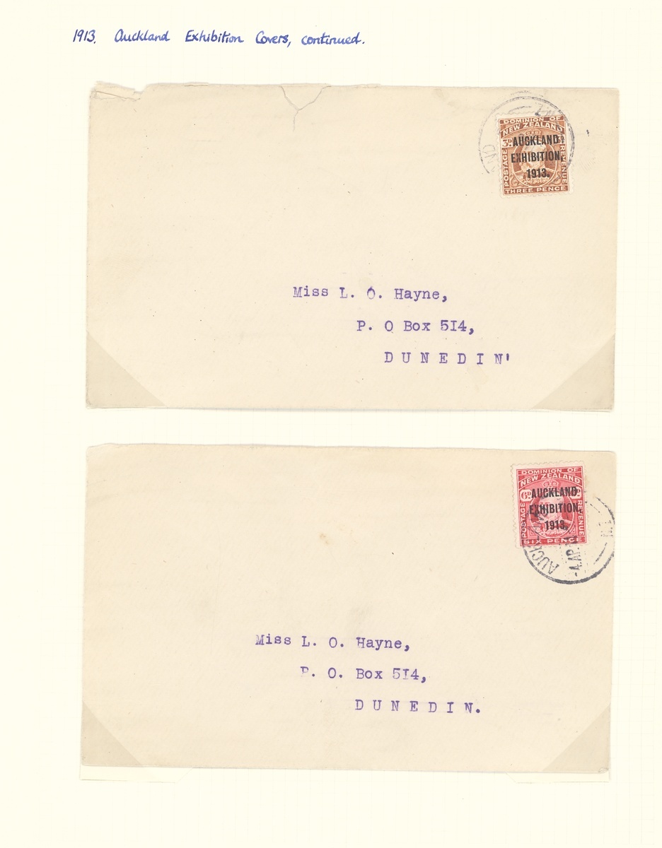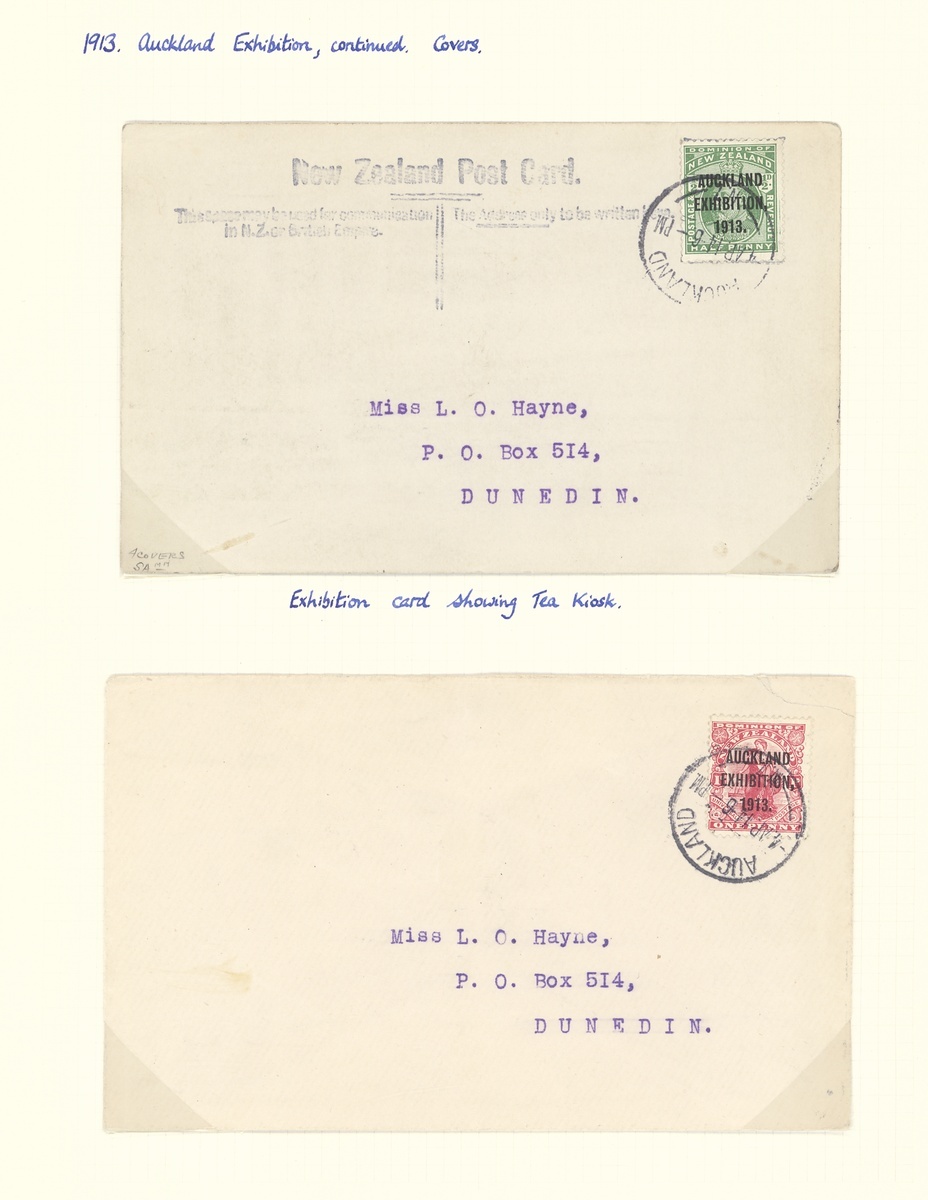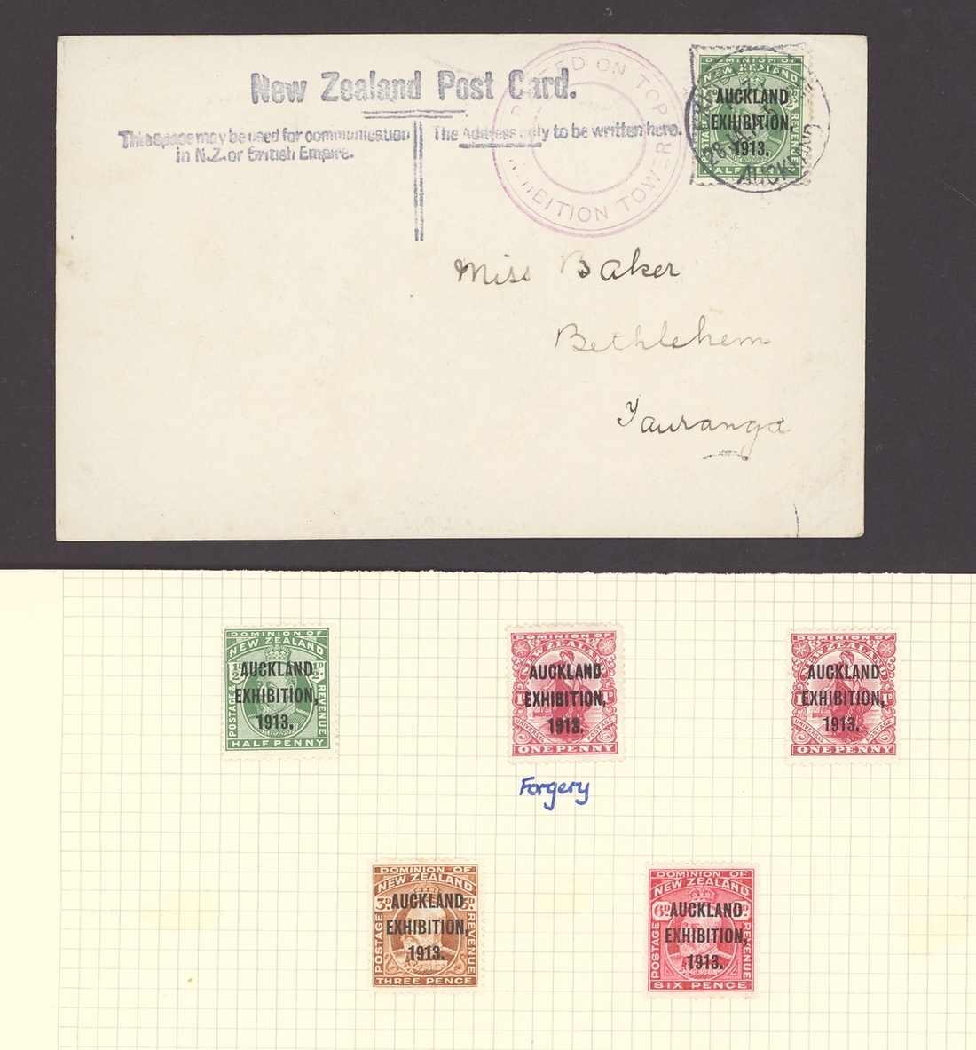 1913 Auckland Exhibition mint set of four to 6d. (and including a 1d. forgery) also a group of covers and postcards comprising ½d. green (2) on postcards and 1d., 3d. and 6d. each on a typed envelope sent to Dunedin; fine. S.G. 412-415, £970+