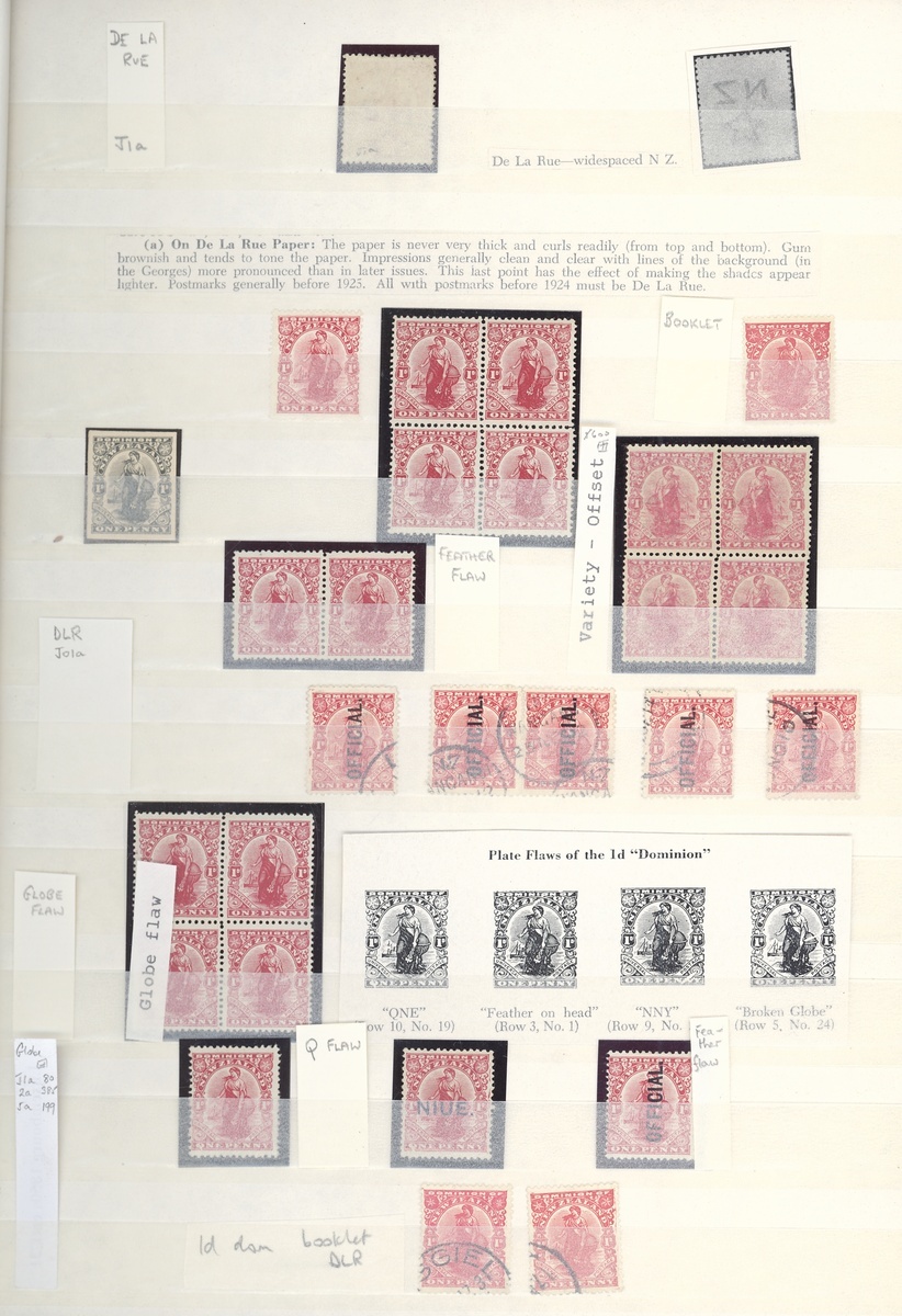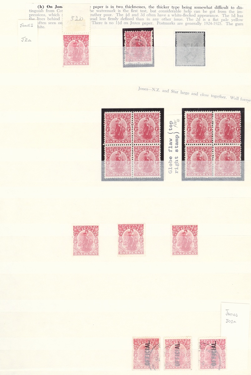 1909-25 1d. carmine mint and used specialised collection in a stockbook including mint with 1909-23 De La Rue with plate proof, pair with feather flaw, blocks of four, one with Globe flaw and another with variety complete offset on reverse, 1924-25 Jones paper with blocks of four, one with 'globe' flaw and another variety complete offset, 1925 De la Rue unsurfaced paper including a block of four, 1925 watermark sideways, also a booklet pane plate proof block of twelve stamps and a booklet pane with Kodak adverts, Officials, other overprints etc. with a good range of used, good to fine. CP $5,000+