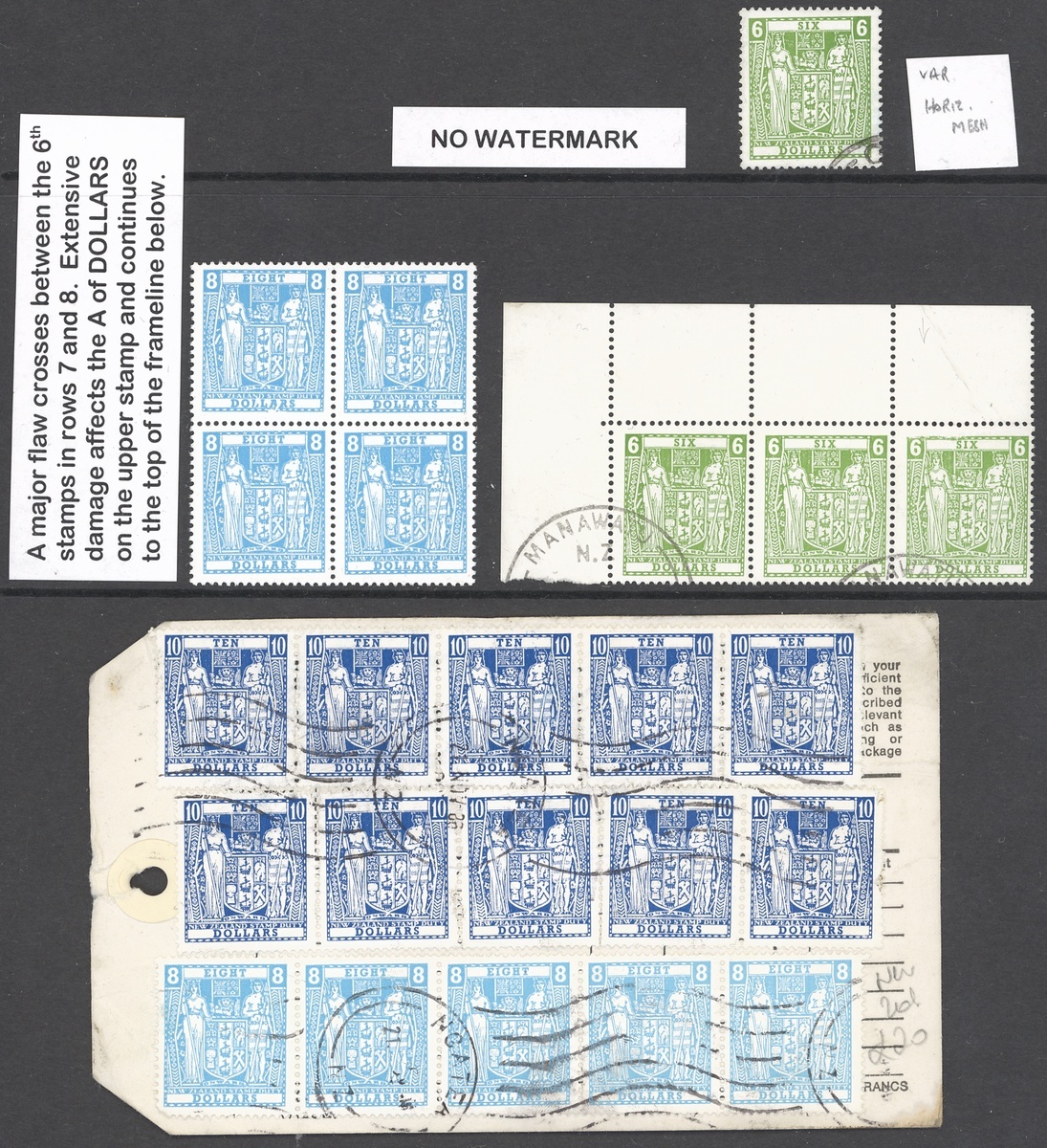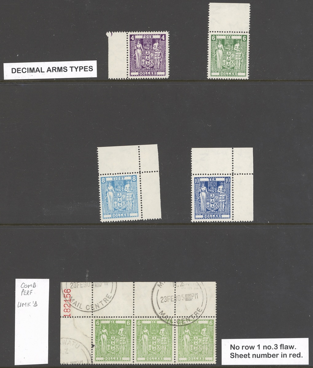 1967-84 Decimal Arms specialised collection on Hagner pages including mint Line perf set to $10, comb perf set mint and also used, multiples including $8 pairs with flaws, $10 block of four, no watermark including $6 strip of three used and $8 block of four mint, parcel label bearing $8 (5) and $10 (10), also the no watermark set used on first day of issue on three covers, includes watermark, plate and paper varieties; chiefly fine