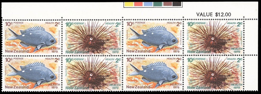 1979 Health Marine Life, Demoiselle Fish and Sea Urchin se-tenant block of eight from the top of the sheet, variety green doubly printed affecting four stamps, fine unmounted mint. S.G. 1197, 1198 var.; CP T51a, T51b (Y), $1,000+