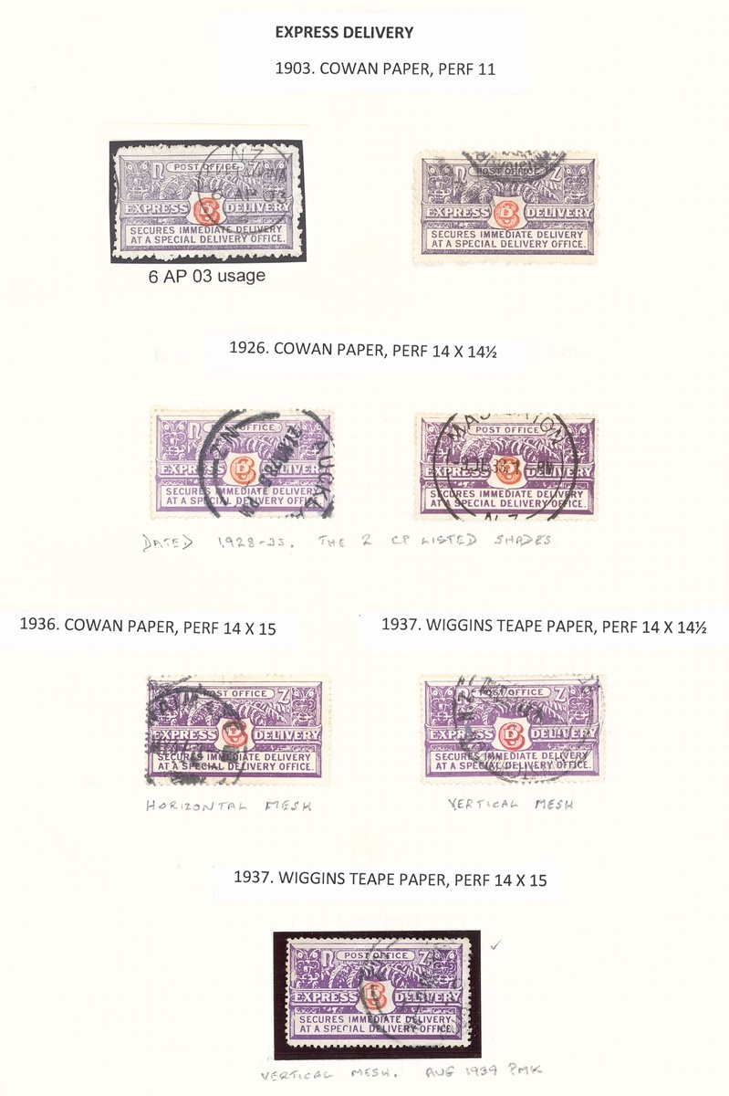 A used group on an album page (7) showing all paper types and perforations including Wiggins Teape perf. 14 x 15, good to fine. S.G. E1-E5, £626