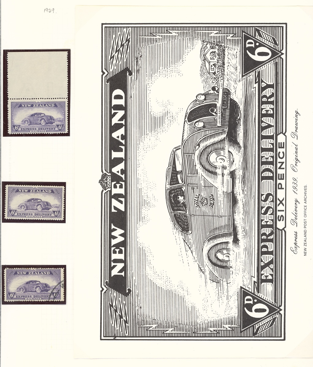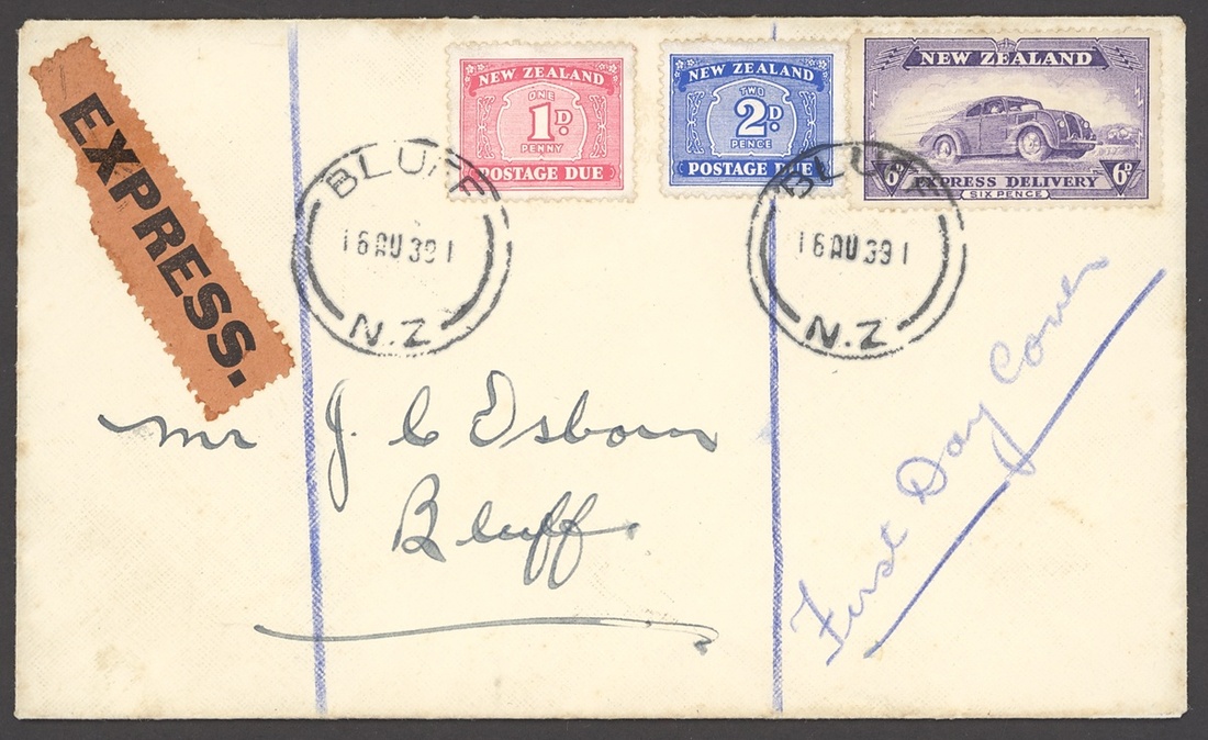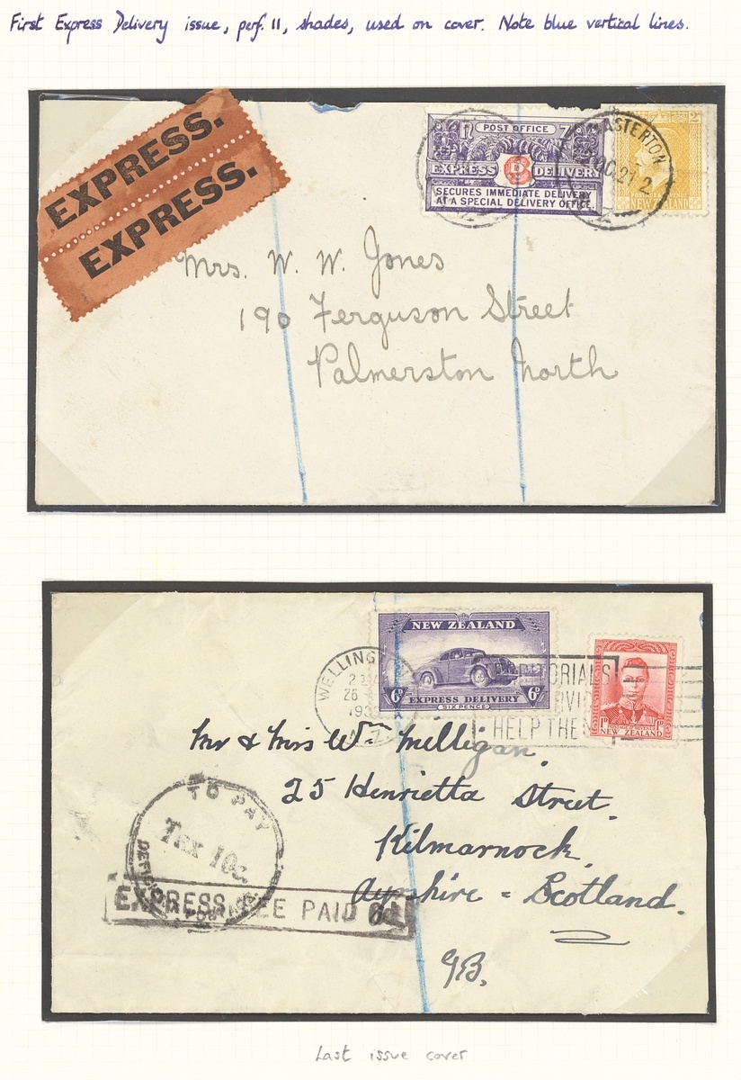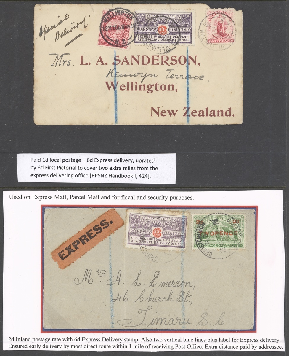 A group of envelopes (5) including a 1905 front to Wellington bearing Universal Postage 1d. and Kiwi 6d. in combination with Express Delivery 6d., 1922 envelope to Timaru bearing 2d. surcharge on ½d. postage and revenue in combination with Express Delivery 6d., 1921 envelope to Palmerston North bearing KGV 2d. yellow in combination with perf. 11 6d. Express Delivery, two envelopes bearing the second Car type 6d. express (one used on the first day of issue); chiefly fine and an interesting group
