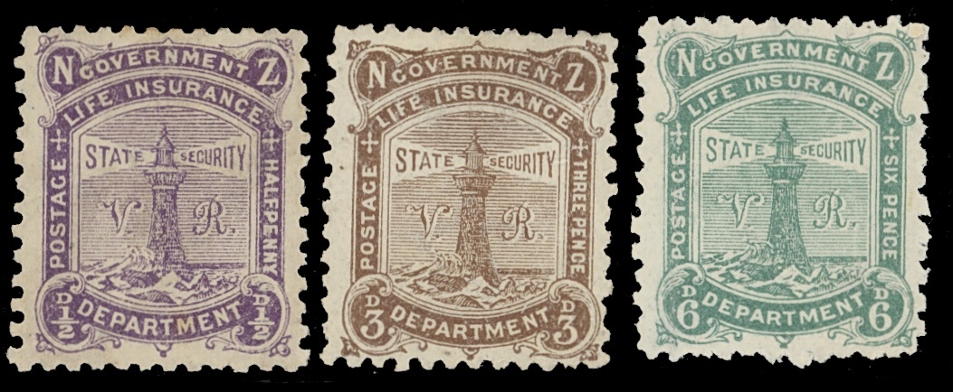 1891-98 perf. 12 x 11½, ½d. bright purple, 3d. deep brown and 6d. green, large part original gum. S.G. L1, L4 and L5, £945, CP $2,550