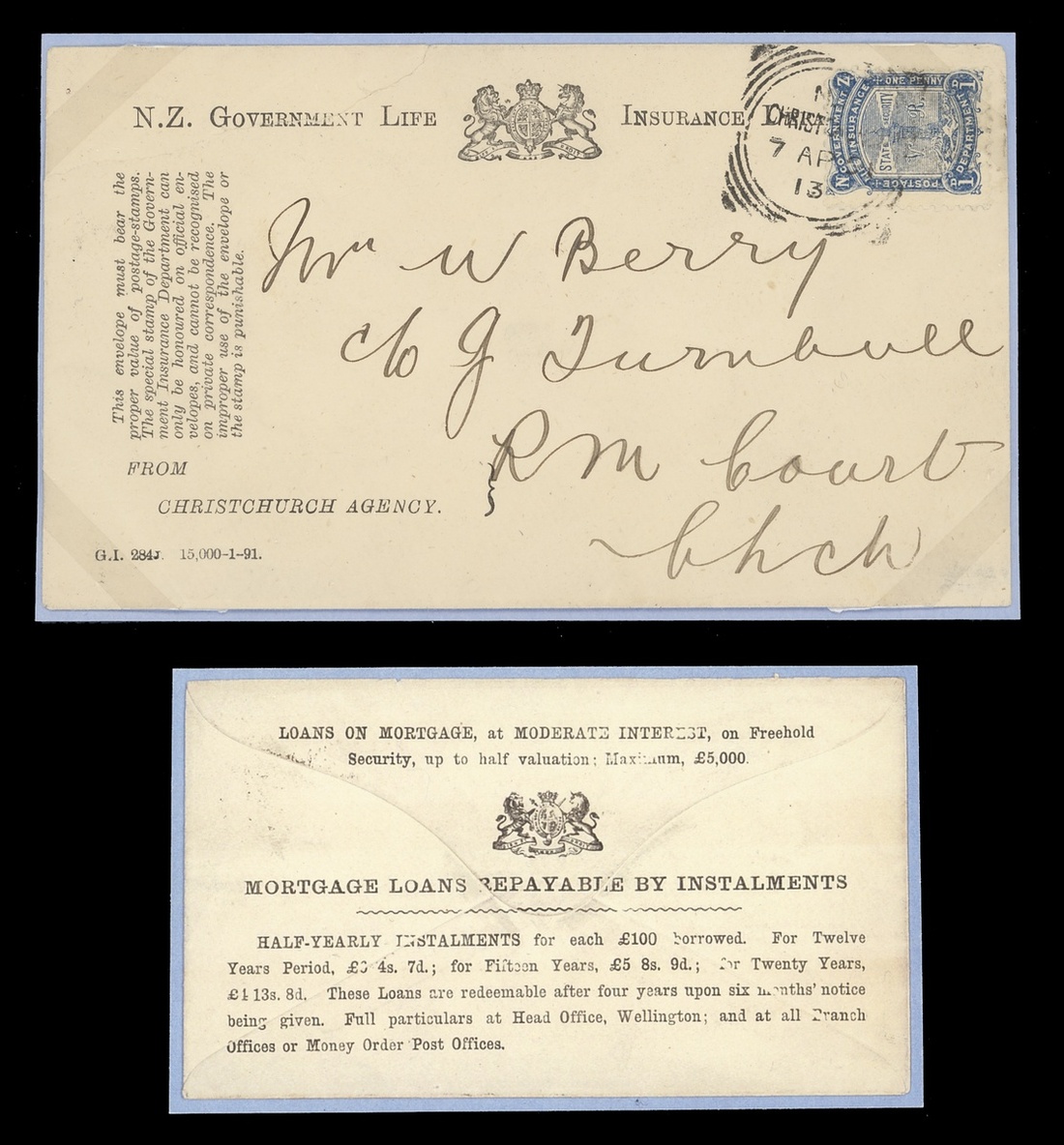 1891 (7 Apr.) envelope sent locally in Christchurch bearing 1d. blue tied by Christchurch squared circle and with mortgage advertisement on reverse and includes a warning about the misuse of the new special stamps; fine and scarce