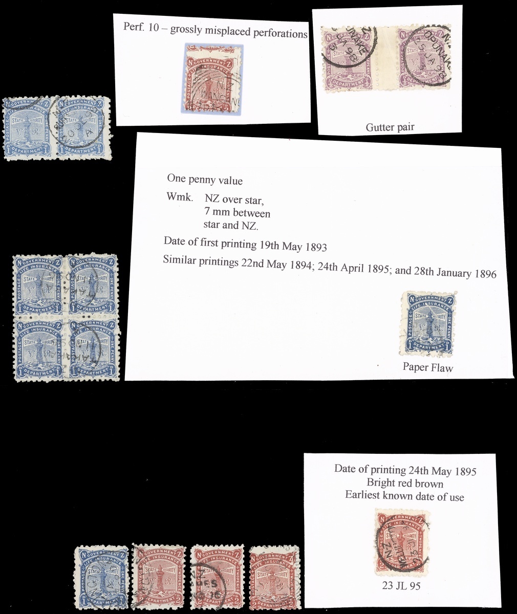 1893 perf. 10, a used group comprising ½d. gutter pair, 1d. with single examples (2), a pair and a block of four, 2d. (5, including a grossly mis-perforated example), also
